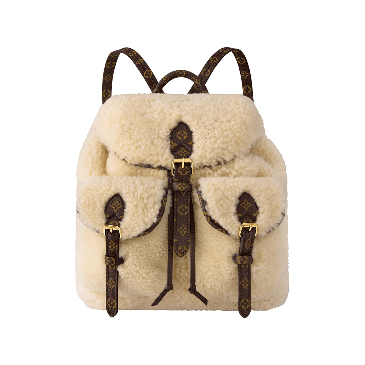 スキーシーズンのゲレンデスタイルに合わせたいスポーティなバックパック。柔らかなシアリングで暖かみのあるコーディネートが完成する。ライニングにはルイ・ヴィトンのモノグラムテキスタイルが使われ、バッグを開けた時まで圧巻。