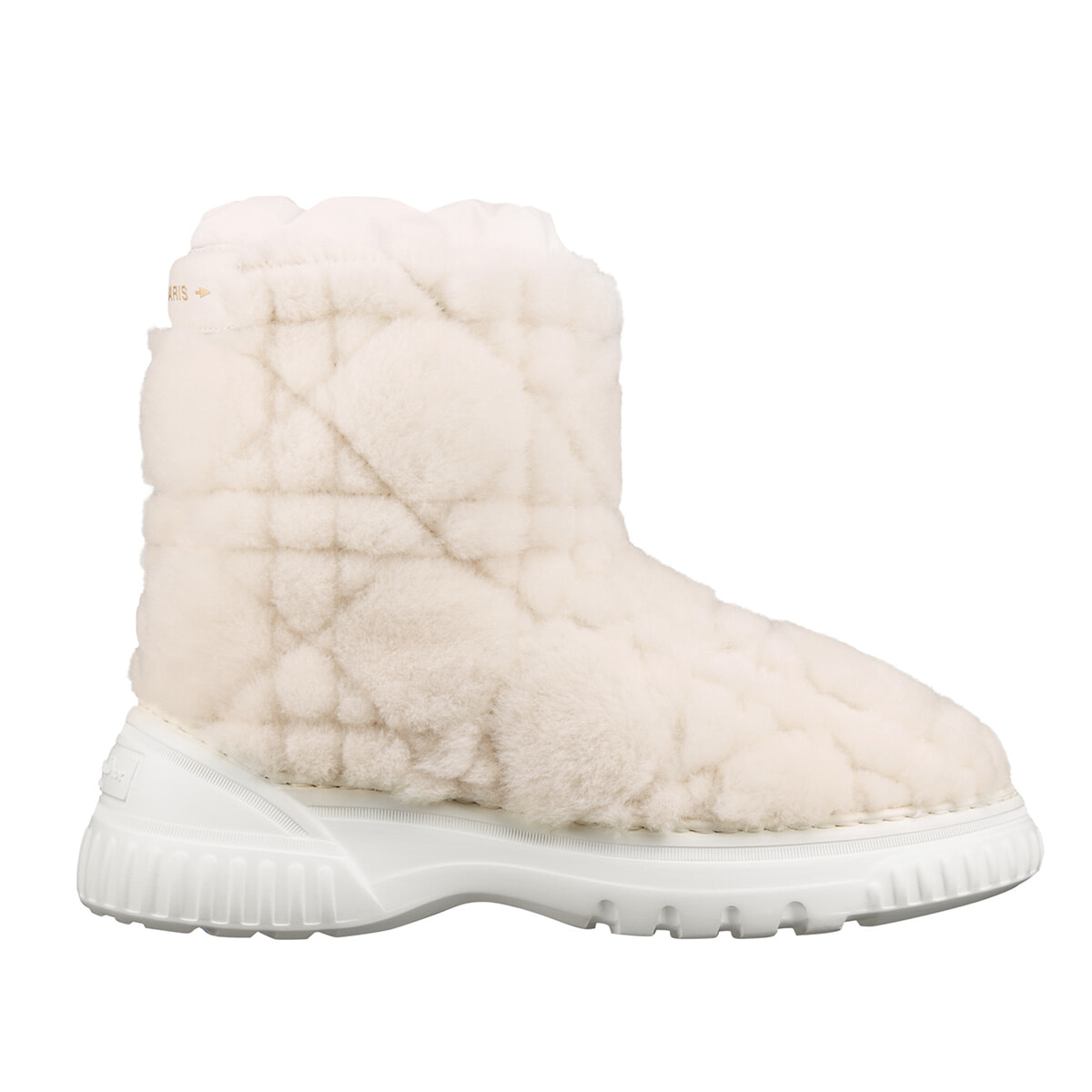 「カナージュ」モチーフをホワイトシアリングに刺繍した「ディオール フロスト」のショートブーツ。同じくホワイトのライトテクスチャーラバーにロゴを施した超軽量ソールで履き心地が良いのも嬉しいポイント。
