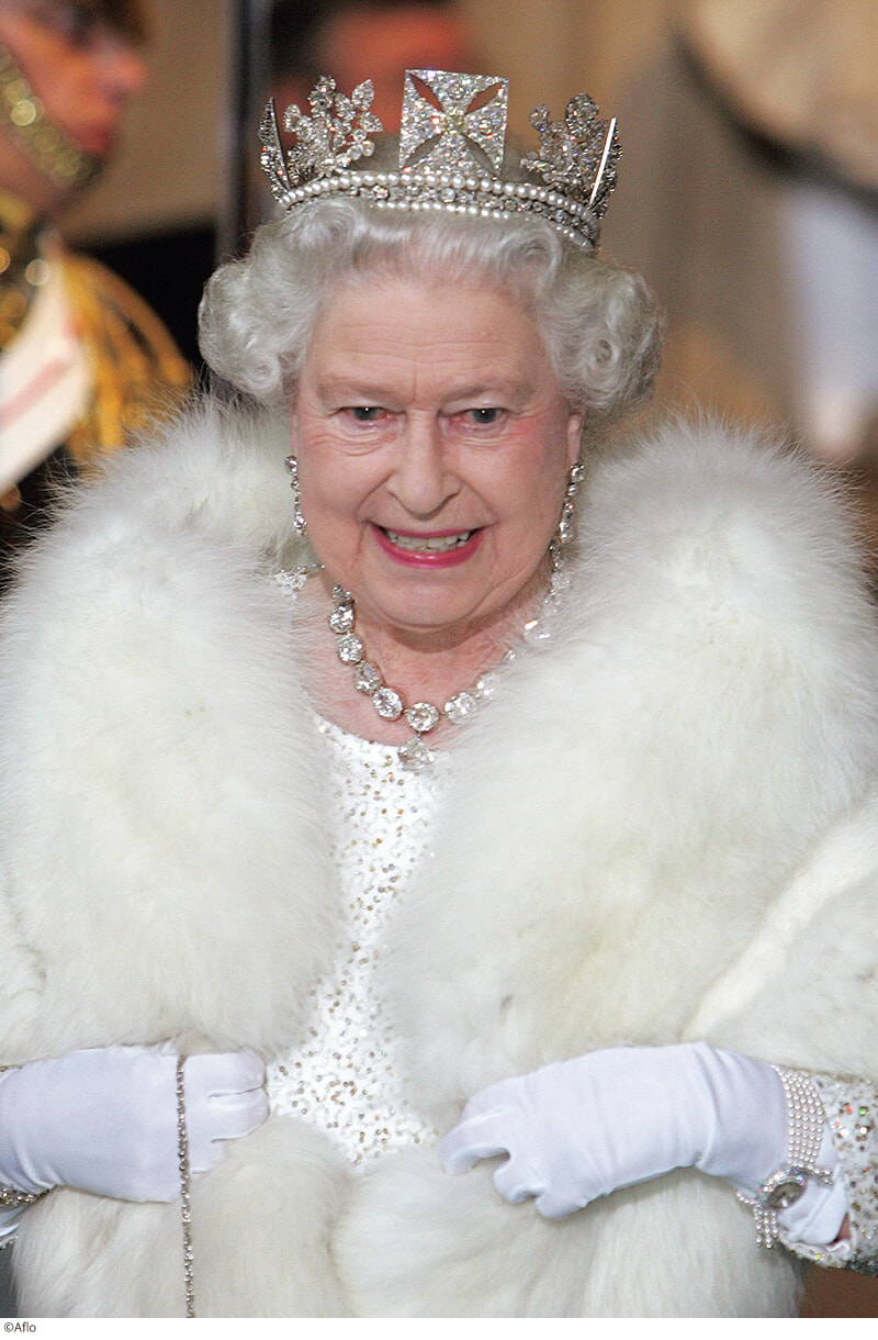 エリザベス女王はパテック フィリップのタイムピースも多数所有。カラトラバ、ゴールデン・エリプスに加え、女王のためだけに作られたというパールのブレスレットタイプRef.4975/1G(写真下)は、イギリス議会の開会式や、ウィリアム王子(当時)とキャサリン妃の結婚式など数々のフォーマルな席で着用した姿が報道されている。