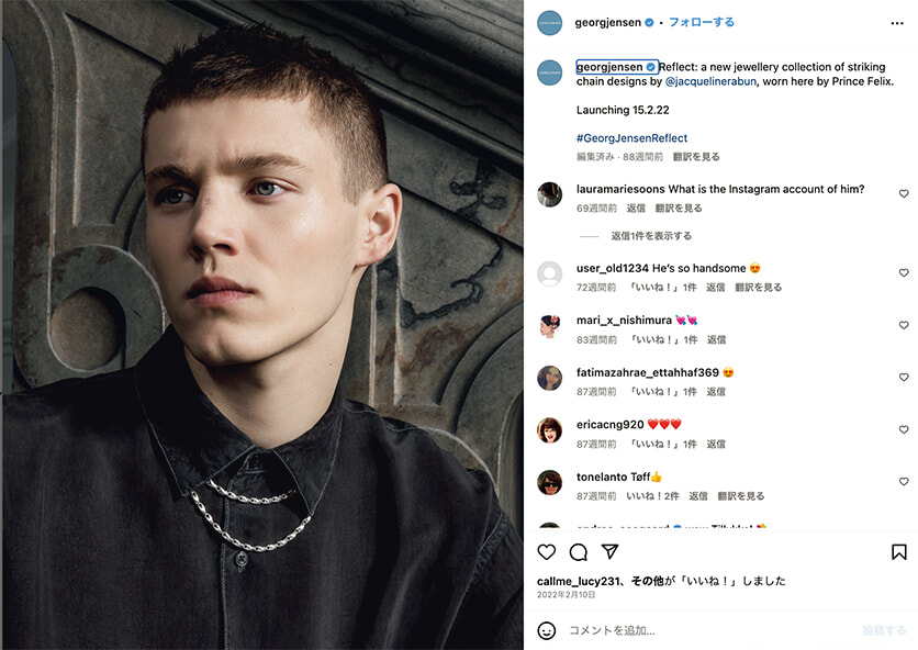 デンマーク王室御用達ブランドとしての歴史を誇るジョージ ジェンセンが2022年に起用したのは、マルグレーテ女王の孫にあたるモンペザ伯爵フェリックス(写真下)。ノーブルなルックスがシルバージュエリーの新たな扉を開いた。