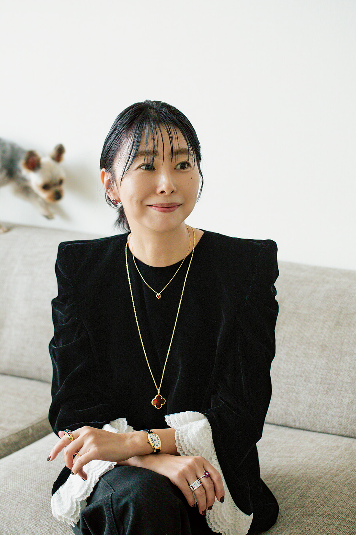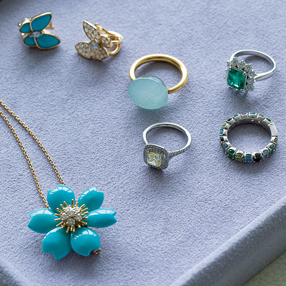 スタイリストをしていたこともあり、ジュエリーを合わせる時には、石の配色を楽しむという。「特にヴァンクリのターコイズのネックレスはお気に入りで、待ちに待って手に入れた、思い入れのあるもの。これを身に着ける時は、ジュエリーを軸にコーディネートを考えます」。エメラルドのリングはお母さまから、色石が並ぶリングは彼女のブランド、SETSUKO&Oのもの。