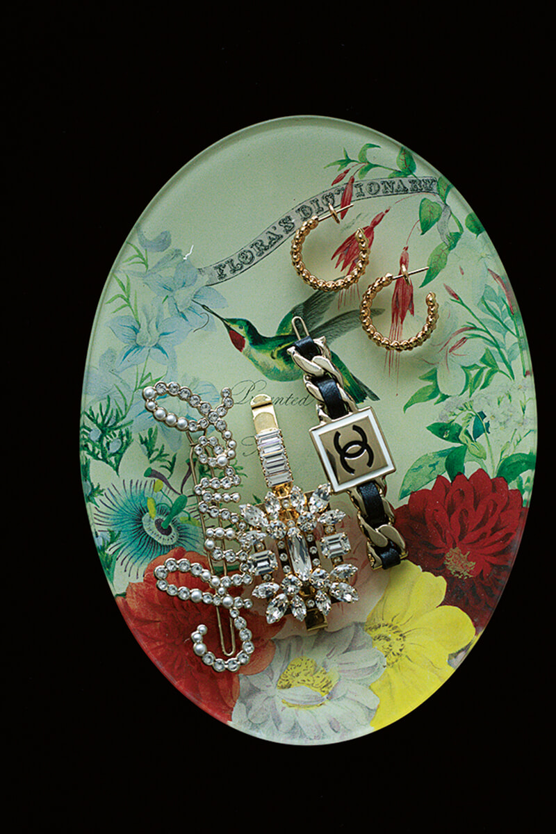 ジュエリーはしまい込まないことも心がけている。「カルティエのピアスとか、デイリーに着けるジュエリーはトレイに上にパッと置くように」。アクセントになるヘアアクセサリーもシャネルやロジェ ヴィヴィエなどがラインナップ。