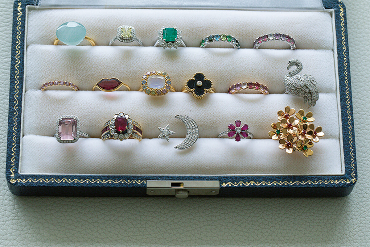 「母の影響で幼い頃からジュエリーが好きでした。私にとって美しいジュエリーは体温が上昇するほどの高揚感をもたらしてくれるもの」と話すのは、元スタイリストで現在はデザイナーとして活躍する大久保節子。スタイリストをしている時から、気に入ったジュエリーを少しずつ集めてきたそう。「身に着けていると自分の視界に入るから、指輪が好きです。綺麗なものを着けていたいし、それで幸せを感じます」。だからこそ、熟考した後に手に入れたジュエリーたちは、どんどん使いたいとか。「初めて自分で買ったのはティファニーのソレスト、イエローダイヤモンドのリング。貯金を叩いても欲しい!と思いました。多少、着けない期間があっても必ずそれにリバイバルする。やっぱり本物だからこそ、時が経っても色褪せない圧倒的な魅力があるのです」