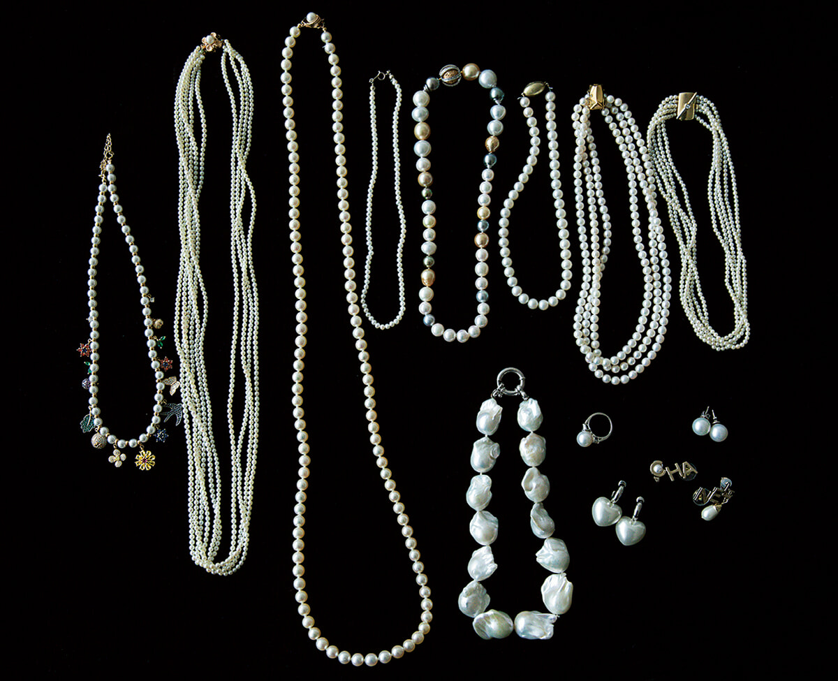 パールはお母さまから譲り受けたものが多いとか。「パールのネックレスは重ね着けすることもしばしば。コスチュームパールも可愛いデザインに目がなくて。ハート形のイヤリングはシモーン ロシャです」