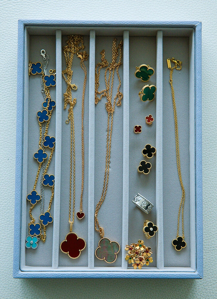「物語があるヴァンクリーフ&アーペルが好きで集めています」。なかでもカラフルな「アルハンブラ コレクション」がお気に入り。