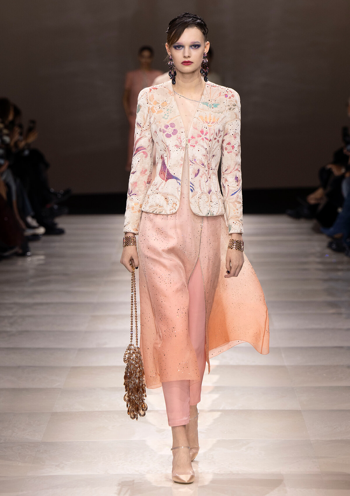 全体に小さなラインストーンを散らした、スリムパンツとモスリンのチュニックに、花鳥柄を描いたジャケットのアンサンブル。ピンクとサーモンカラーの優しいグラデーション、オリエンタルな香りが漂うアンサンブルがショーの幕開けを告げた。