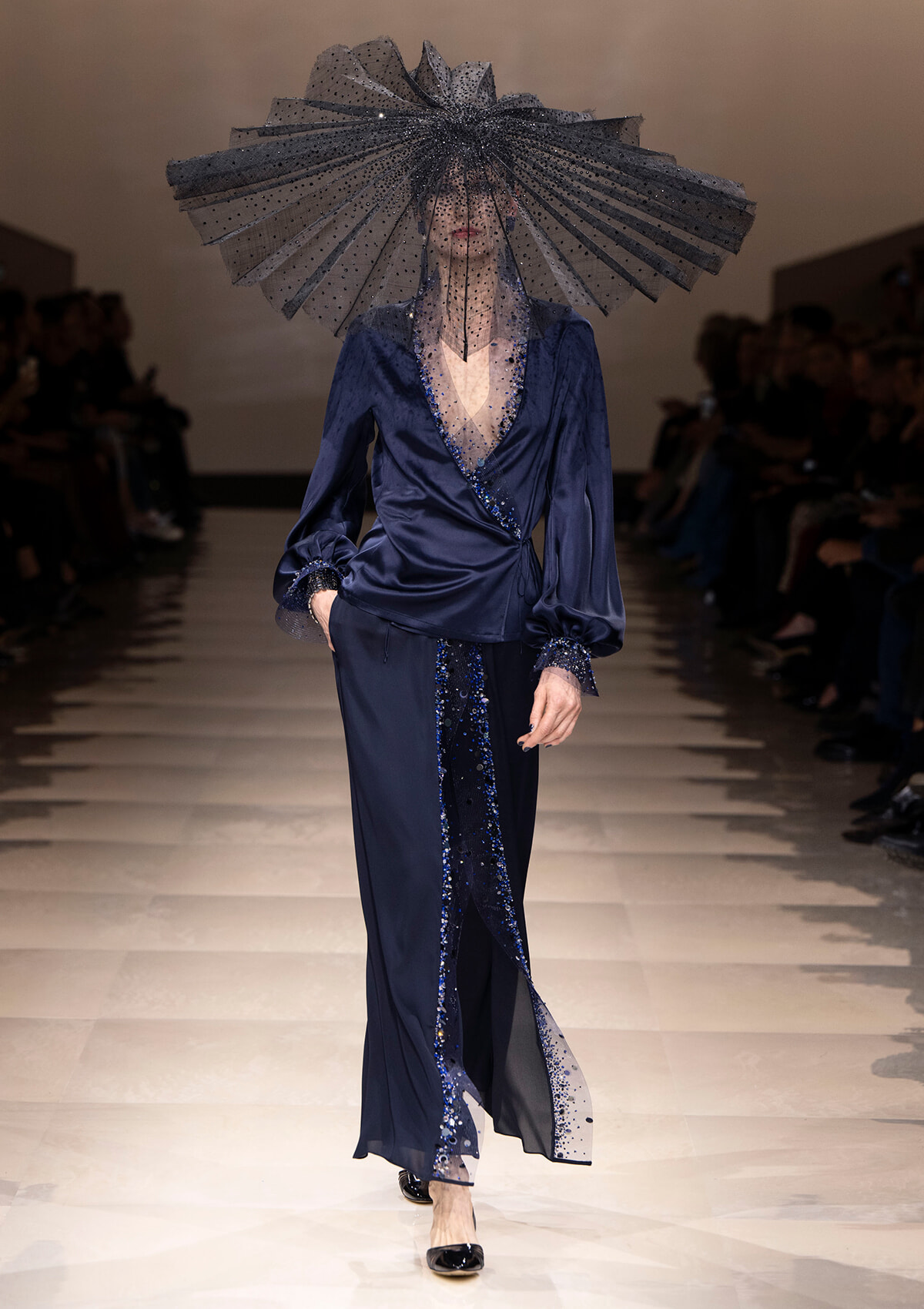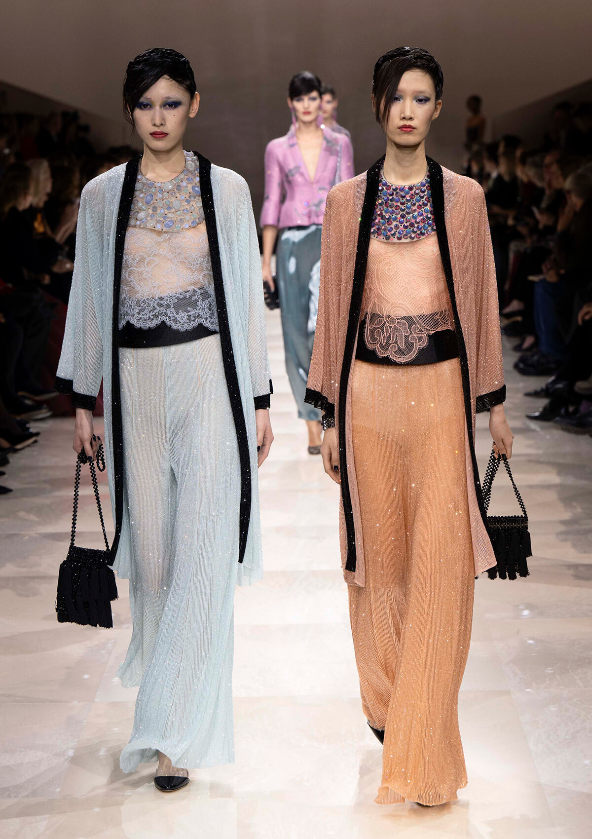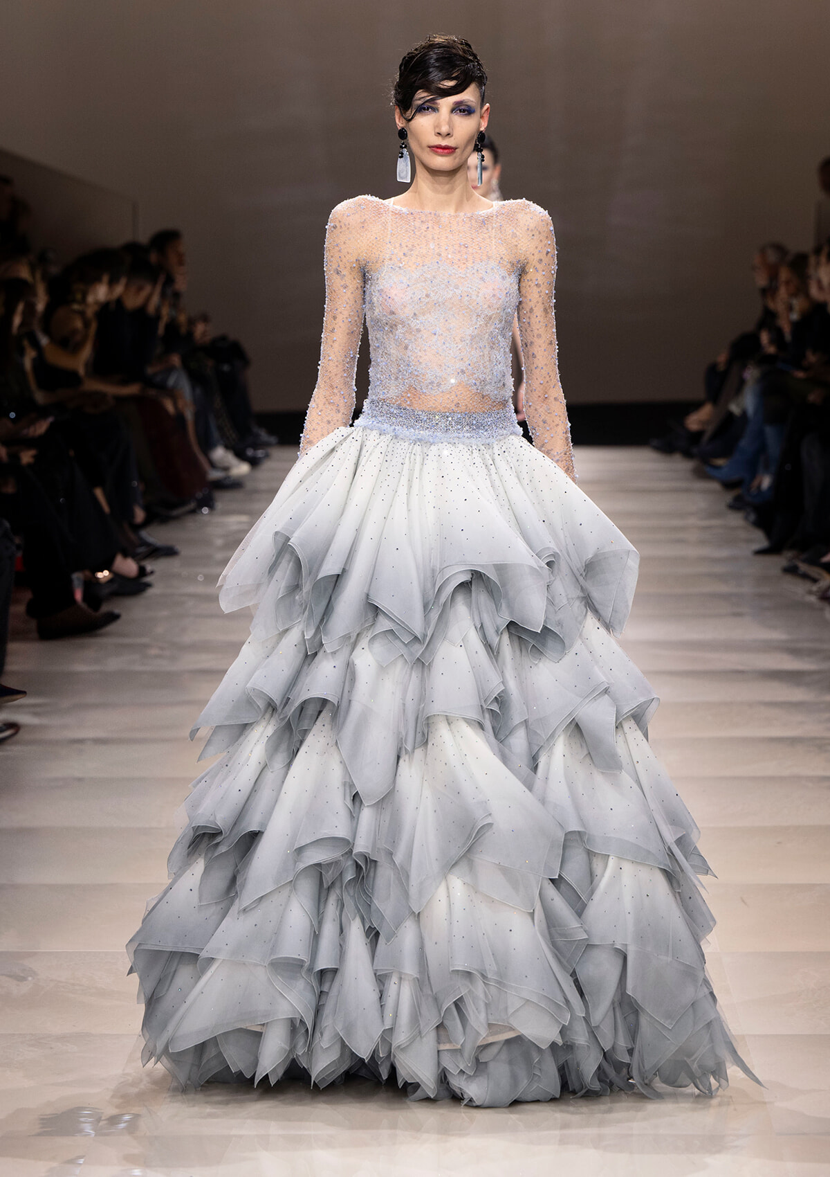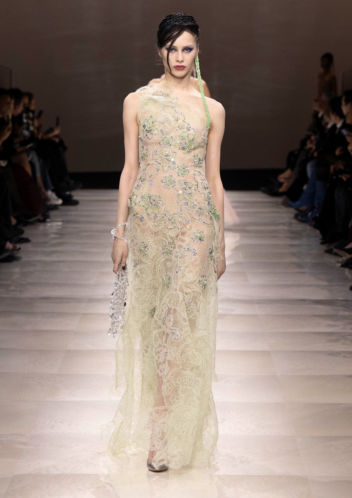 90ルック以上からなるコレクションは、オートクチュールの手仕事や技法をたっぷりと盛り込んで、西洋と東洋のインスピレーションを行き来しながらグラマラスなソワレの装いに昇華させたもの。シースドレスのシルエットや大人の女性を演出するパンツルックなど、柔らかなロング&リーンのアルマーニらしいシルエットが貫かれている。長いキャリアを誇るアルマーニならではの、尽きることのないインスピレーションのミックスと豊かなサヴォワールフェールを感じさせるコレクションだ。