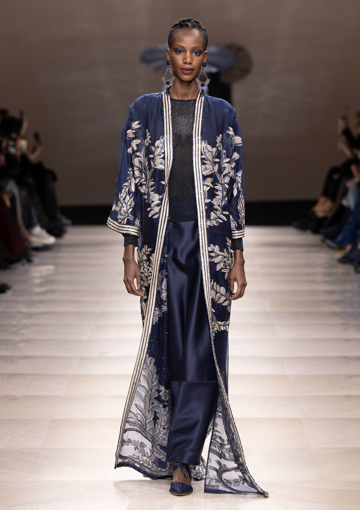 ペールピンクから翡翠のグリーン、ソフトブルー、ゴールドフラッシュからミッドナイトブルー、ロイヤルブルーまでのアクアトーンを中心とする優雅なカラーパレット。細いパンツとチュニックやジャケットの重ね着、黒いサテンの縁取りのパジャマルックやキモノローブ、マーメイドドレスといった細く長いシルエットとともに、エアリーなスカートが揺れるビュスチェドレスも登場。繊細なレース、華やかなジャカード、ビーズ刺繍やスパンコール刺繍といった、オートクチュールらしい手仕事のディテールがふんだんに施されている。ドレスに合わせた扇形のクラッチバッグや、フィナーレのルックに合わせた、傘を思わせる帽子などが、オリエンタルなスパイスを加えた。