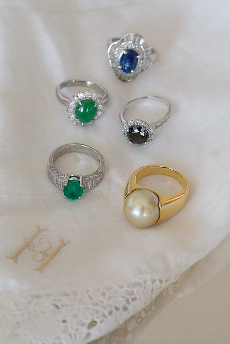 「私は小柄で手も小さいからと、私に合ったサイズのエメラルドやパールを探してくれた主人。誕生日に贈ってくれたリングや、主人が好きなミッドナイトブルーの石のリングなど、彼からプレゼントされたジュエリーは大切なお守りです。入籍前にもらったダイヤモンドのリングは、いまでも毎日、身に着けています」。ほかにもお母さまから譲り受けたサファイアや翡翠のリングや存在感たっぷりのパールのリングなど、着物にも合うデザインのものがずらり。