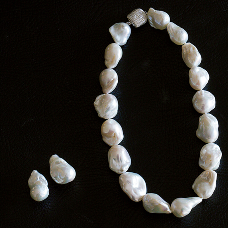 素敵なバロックパールを見つけたので、友人のジュエリーブランド、アランジーナにて自分でデザインしたネックレスとイヤリング。「首にピッタリとしたデザインが好きで、チョーカータイプにしました。余ったパールでイヤリングもセットで」