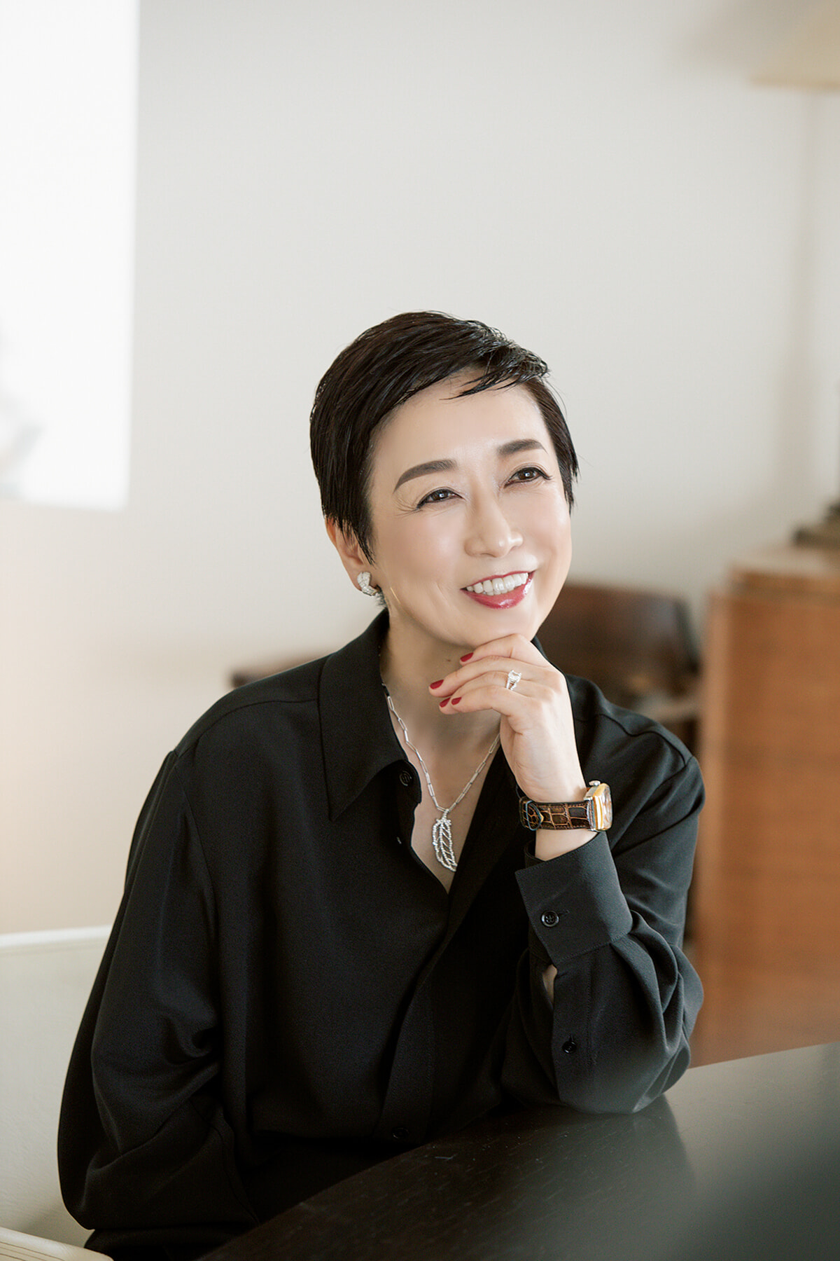 「亡き主人がデビアスのダイヤモンドで特別に作ってくれたリングは、両サイドにふたりのイニシャル「H」と「K」が刻まれています。カジュアルな服装の時でもかた時も外しません。彼が愛用していた時計など、記憶と深く結びついたものを着けていると安心します」とは田原博子。世界的写真家の田原桂一の妻で、歌舞伎役者の片岡千之助を息子に持つ彼女にとって、宝飾品は特別な存在だ。「どこのブランドのジュエリーが欲しいとか、私にはあまりなくて。ご褒美に自分で手に入れるより、人生の節目に主人や家族から贈ってもらったものが多いですね」と語る。思い出が詰まった美しいジュエリーを見ていると、自分はたくさんの人に愛をもらい、支えてもらっているのだ、と実感するのだとか。「私にとってジュエリーとは、自分のルーツを改めて感じさせてくれるものです」