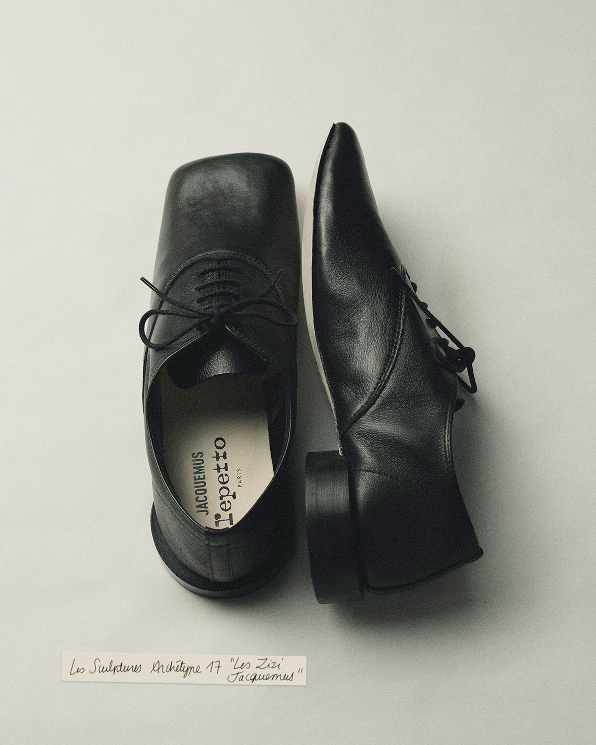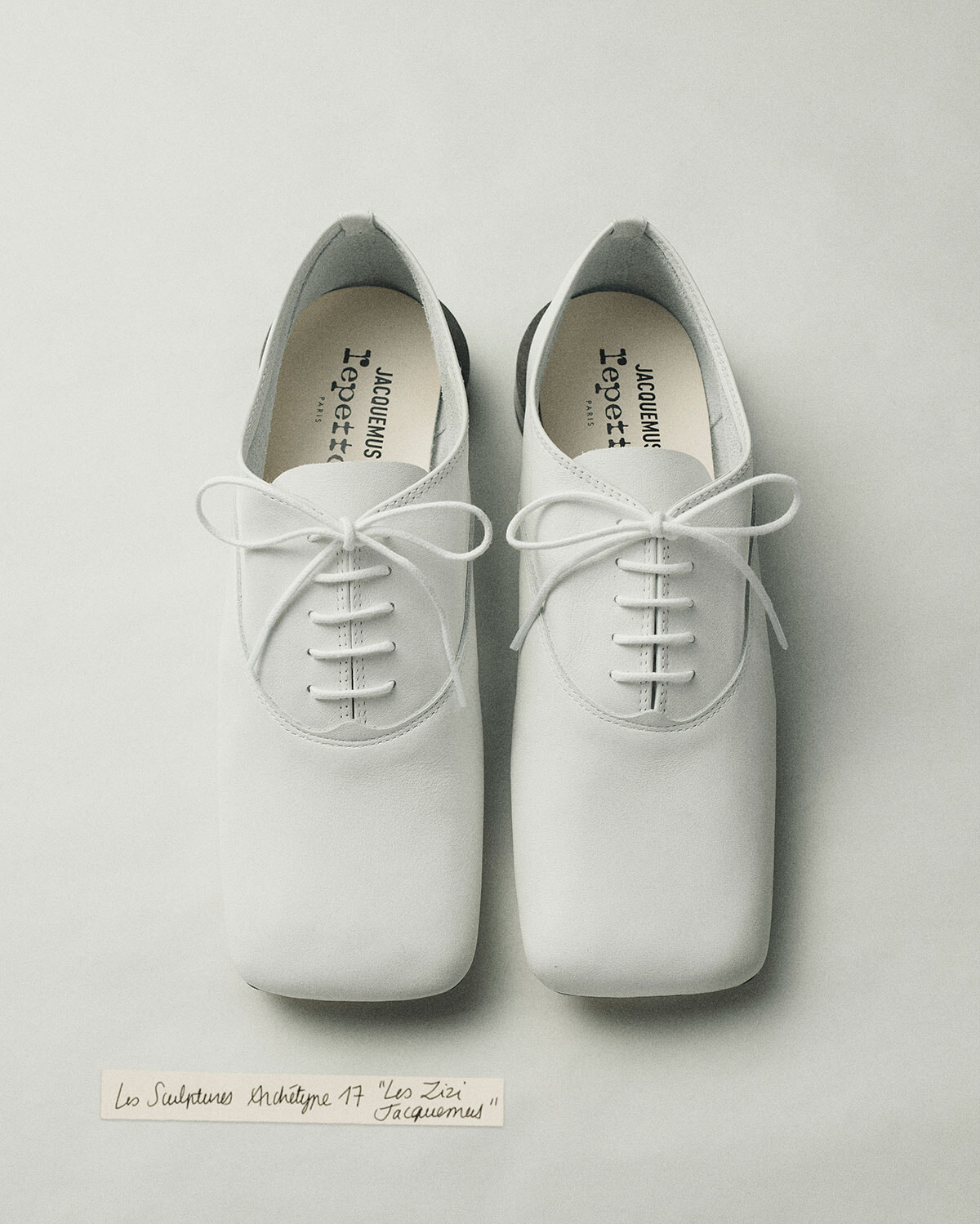 このスペシャルなコラボレーションシューズは、”Les Sculptures(彫刻)”と題されたジャックムスの新コレクションにて、レペットのタイムレスなオクスフォードシューズ「ジジ」を新解釈したもの。ジャックムスらしい幾何学的ディテールであるスクエアトゥのアッパーと、サーキュラーヒールを加えたユニークで遊び心あふれるデザインに仕上げている。