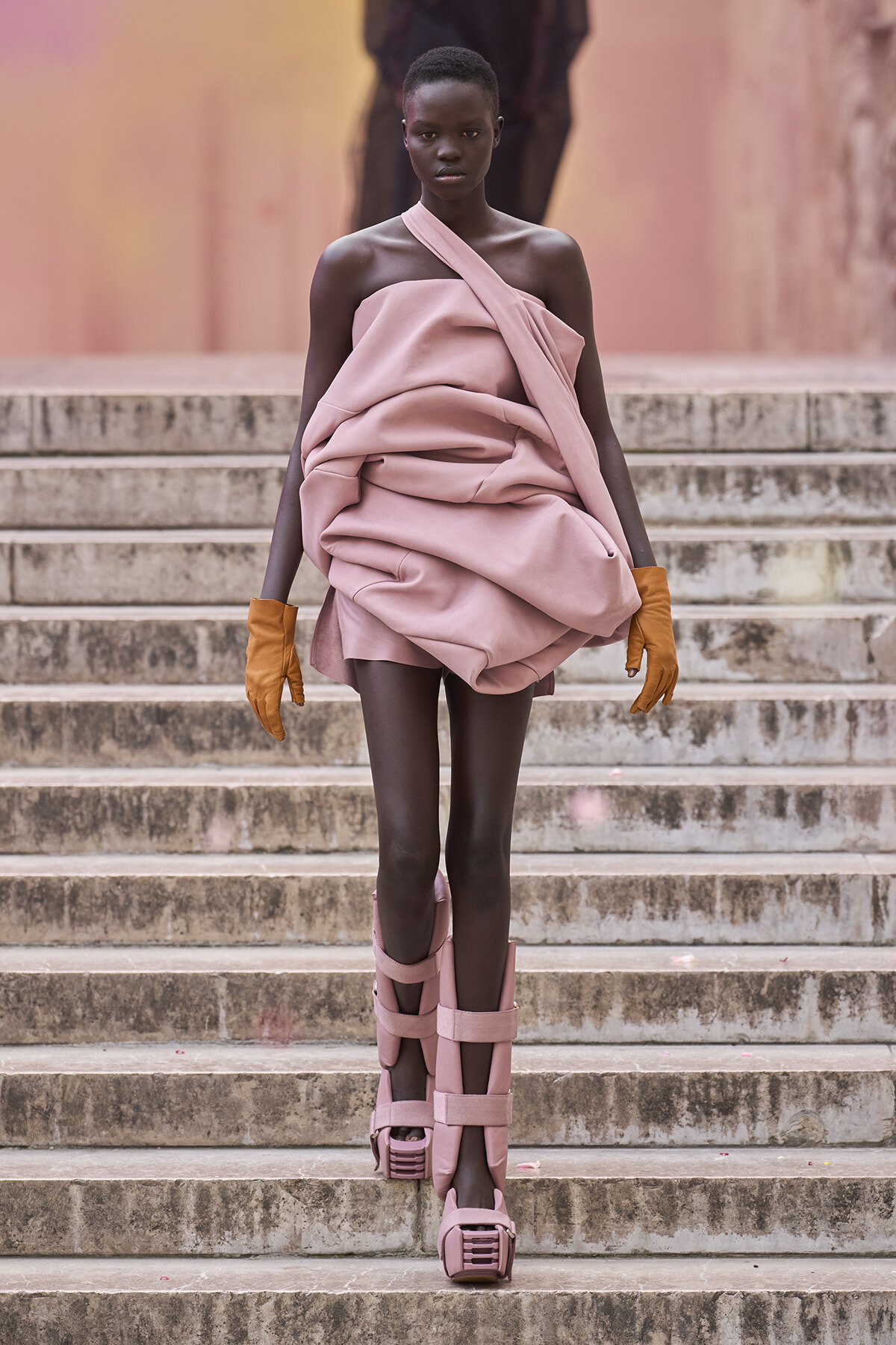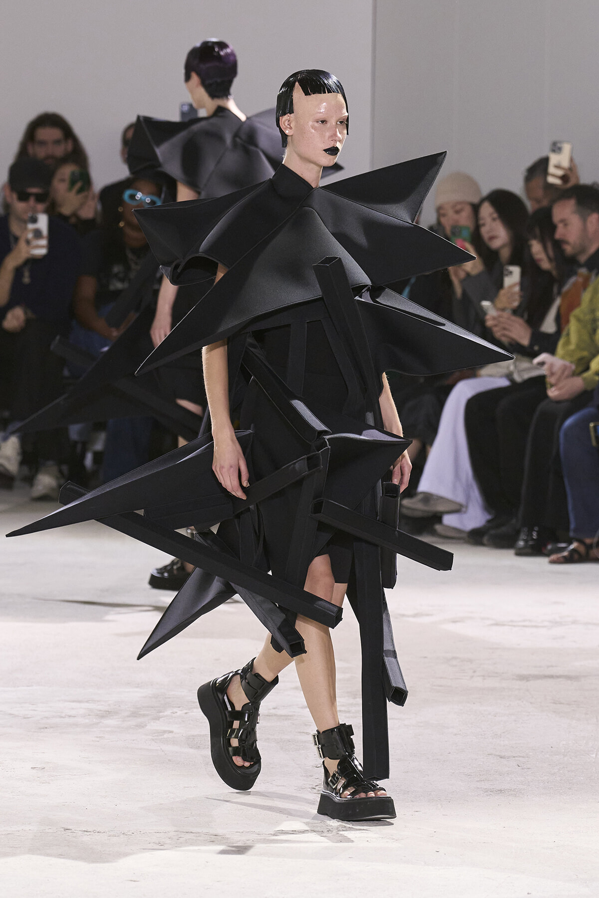 その斬新なフォルムとボリュームに目を奪われる。「オブジェを作る」を出発点にゼロから服を造形したジュンヤ ワタナベ、彫刻家ロダンの言葉に触発されて「新しいシェイプを彫り出す」をテーマにしたサカイ。ボッテガ・ヴェネタやアレキサンダー・マックイーンはラッフルがレリーフのように浮かび上がる。服は布の彫刻というデザイナーたちのクリエイティブな挑戦。