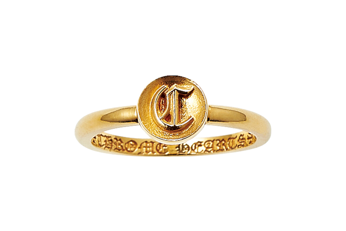 カリグラフィで人気のフォント、オールドイングリッシュのアルファベットが、職人の手により精緻に刻まれたリング。22Kの深みのある輝きは丸みのあるデザインで、身に着けると愛らしい手元に。(22K)¥239,800/クロムハーツ(クロムハーツ トーキョー)