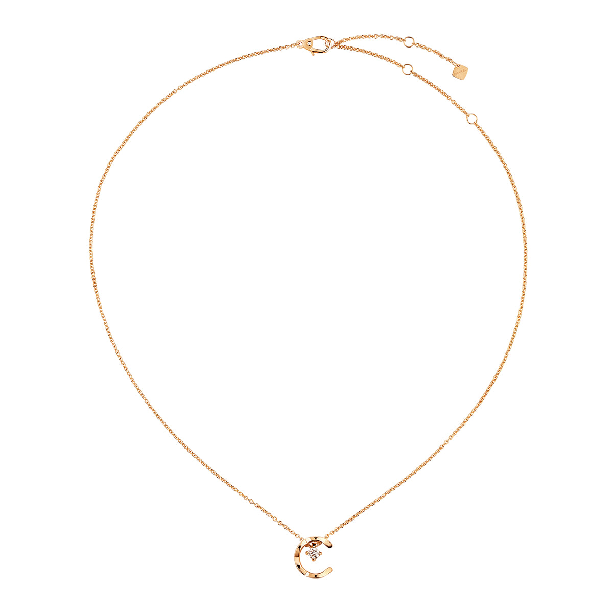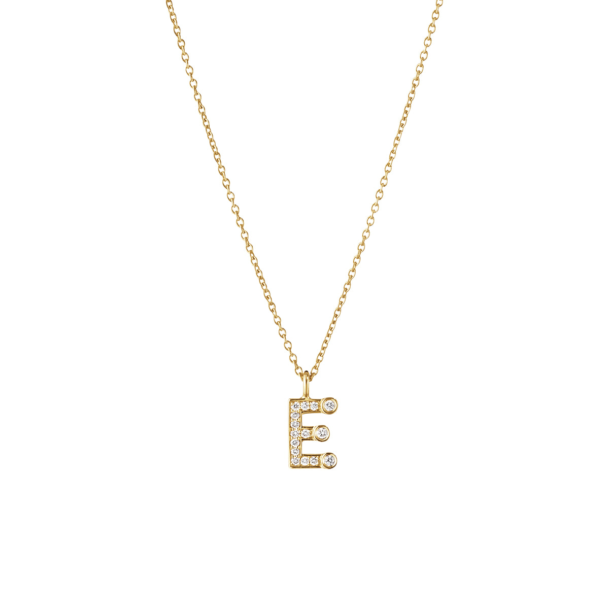 手書きのような温もりを感じる文字は先端にベゼルセッティングのダイヤモンドがあしらわれ、大小異なるサイズにより、胸元で立体感のあるデザインが楽しめる。ネックレス「シンプル E」(YG×ダイヤモンド)¥231,000/ソフィー ビル ブラーエ(チェリッシュ インク)