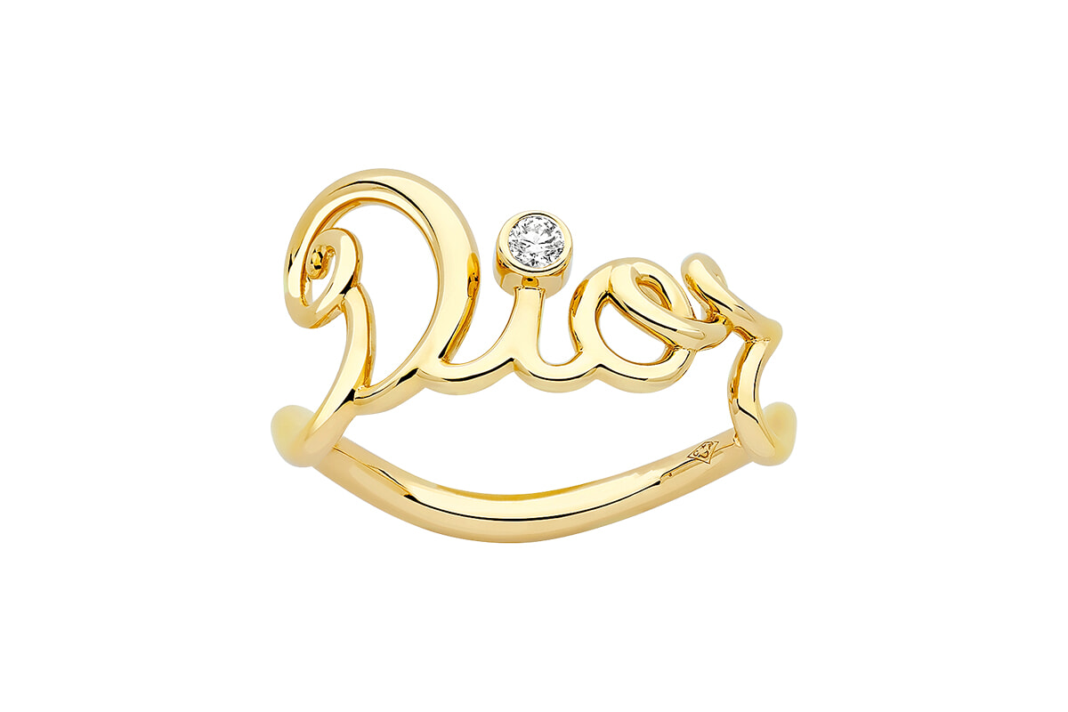 クチュールを讃えてゴールドを柔らかな糸に見立て、メゾンの名前を描いたリングが、人気の「Oui」コレクションに仲間入り。愛と絆を表現している。「ディオール アムール」(YG×ダイヤモンド)¥270,000/ディオール ファイン ジュエリー(クリスチャン ディオール)