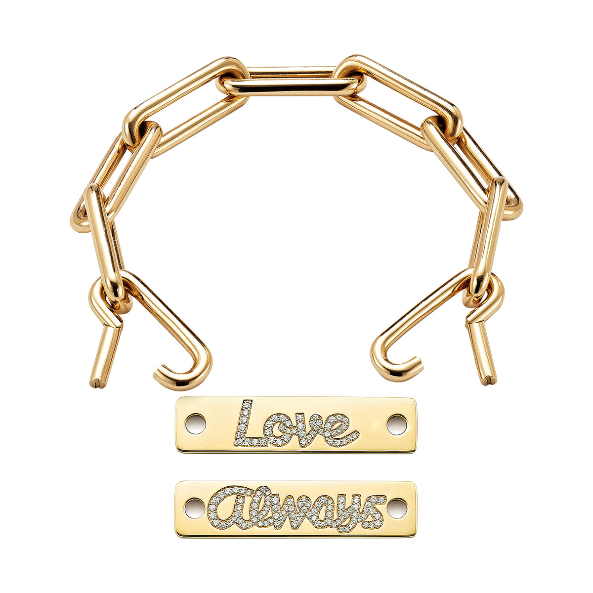 プレートの大字はアレンジ可能、両面にダイヤで好きな言葉を記して。「アイデンティティ ブレスレット」(YG)¥1,250,000、「アイデンティティ トークン バー ラブ/オールウェイズ」(YG×ダイヤモンド)¥1,980,000/ともにロビンソン ぺラム(チェリッシュ インク)