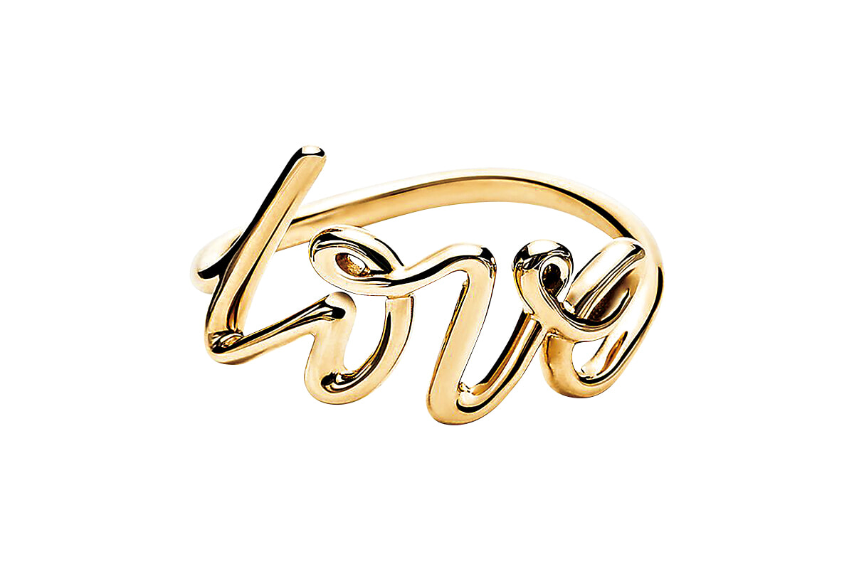 ニューヨークの建物の落書きをヒントに、パロマ・ピカソの直筆によりデザインされたリング。loveと綴られた文字にもデザイナーの味わいとセンスが宿る。「パロマ グラフィティ」(YG)¥111,100/ティファニー(ティファニー・アンド・カンパニー・ジャパン・インク)