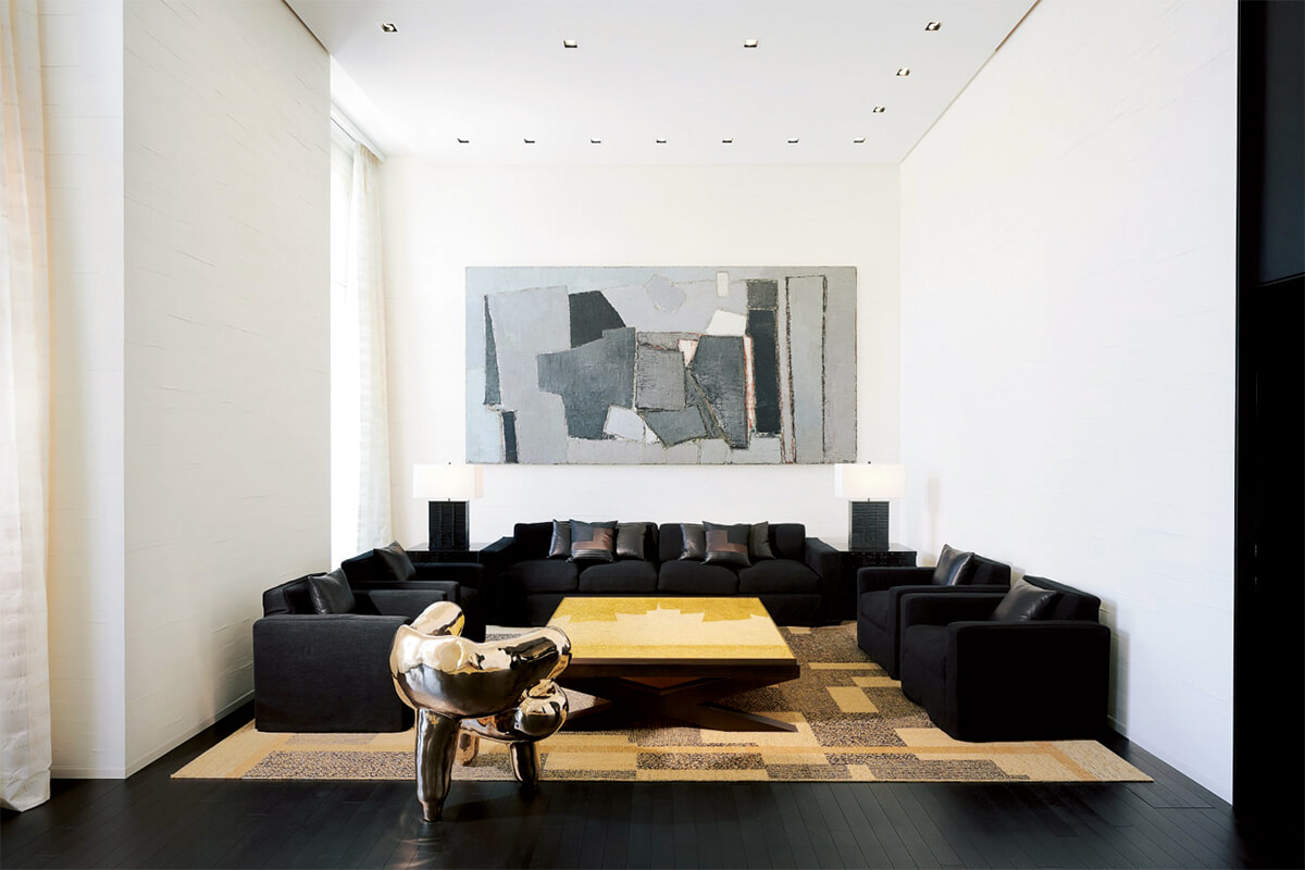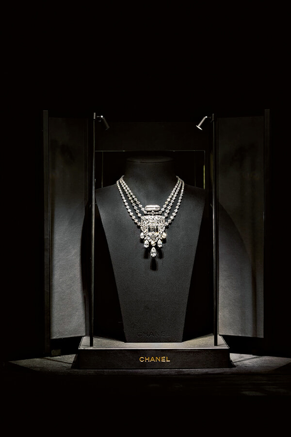 本店内で一般に公開されていないのはパトリモニーフロア、そして3階の広場に面して広がるヴァンドームサロン。その次の間は地下に所蔵するジュエリーからの展示を行っているが、カスタムカットされた55.55カラットのダイヤモンドをセンターに配した「55.55」ネックレスが暗い空間に燦然と浮かび上がる姿は神々しいほどだ。ヴァンドームサロンでゲストをもてなすのは、広場の見事な眺望と20世紀を代表する抽象画家ニコラ・ドゥ・スタールの油彩画『コンポジション』である。先鋭的で贅沢なモダニズムを表しつつも古代的な永遠主義を有する点、シャネルというメゾンの価値と通じ合うものがあることから選ばれた傑作だ。