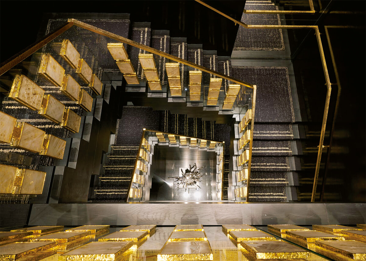 1階、ゴールドの壁に囲まれてヨハン クレテンのブロンズ塔がそびえる吹き抜けの売り場。ツイードタッチの絨毯、クリスタル・シャンデリアにシャネルらしさが光る。