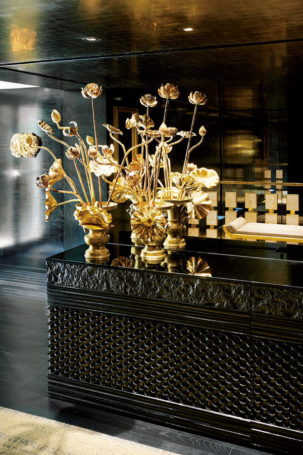 明治時代に製作された木製のハスの花のブーケ。本店の装飾は骨董とコンテンポラリーのオブジェが混じり合う。