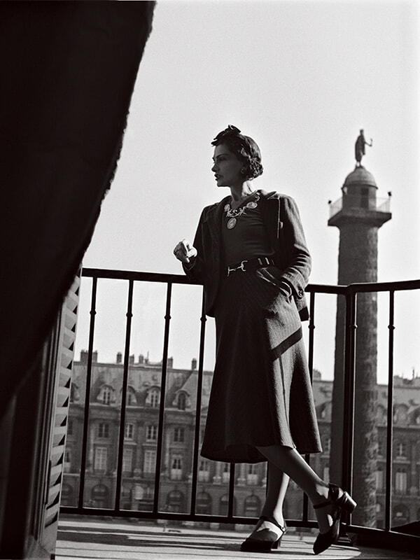1937年に撮影された写真。晩年、中央にナポレオン像をいただく円柱が立つヴァンドーム広場に面したリッツ・ホテルにガブリエル・シャネルは暮らしていた。©Collection Schall