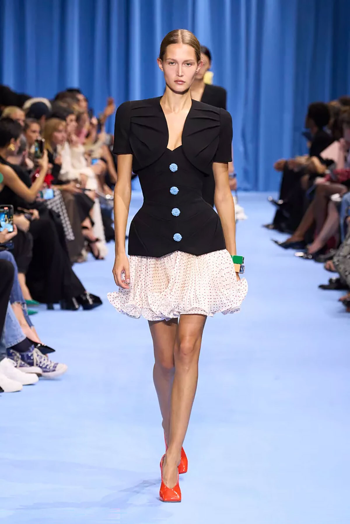 水玉といえば往年のピンナップガールの服が思い浮かぶ。2024年にドットが復活し、あちこちで見かけた。ディオールではドレス、ヨウジヤマモトの最新コレクションではウェストを絞ったスーツのジャケットの一部にあしらわれていた。バルマン2024年春夏コレクションでも、水玉の人気復活を象徴するように、カクテルドレスやスカート、スーツ、薄地ブラウスにあしらわれていた。