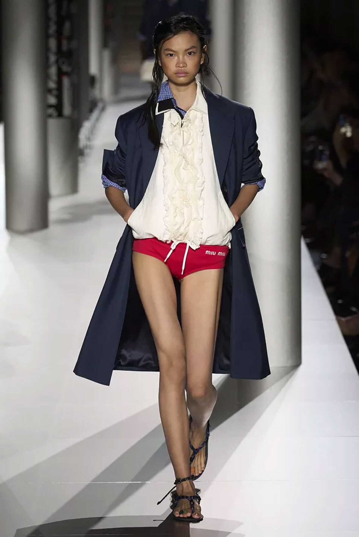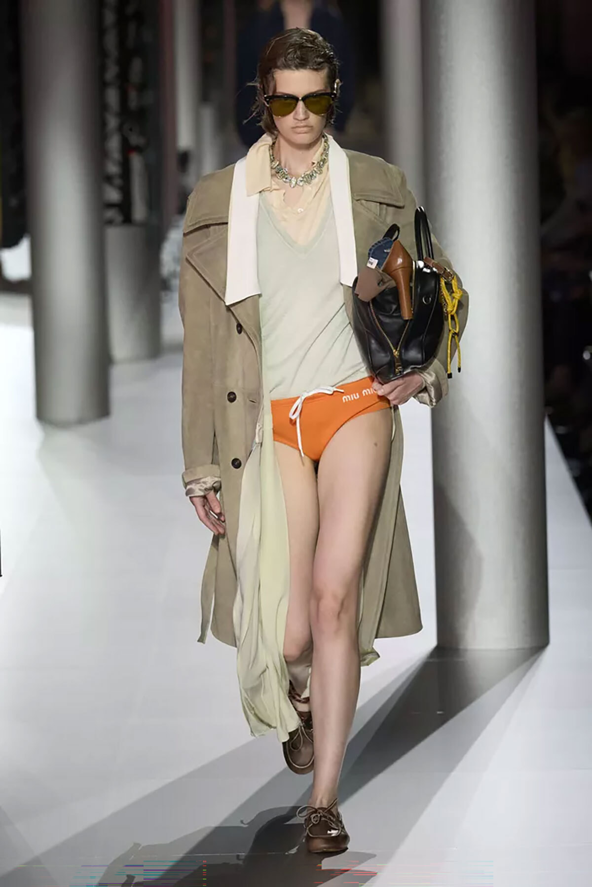 「ノーパンツ」、つまりズボンさえはかないファッション。ミュウミュウ2024年春夏コレクションにて。(パリ、2023年10月3日)photography:Imaxtree