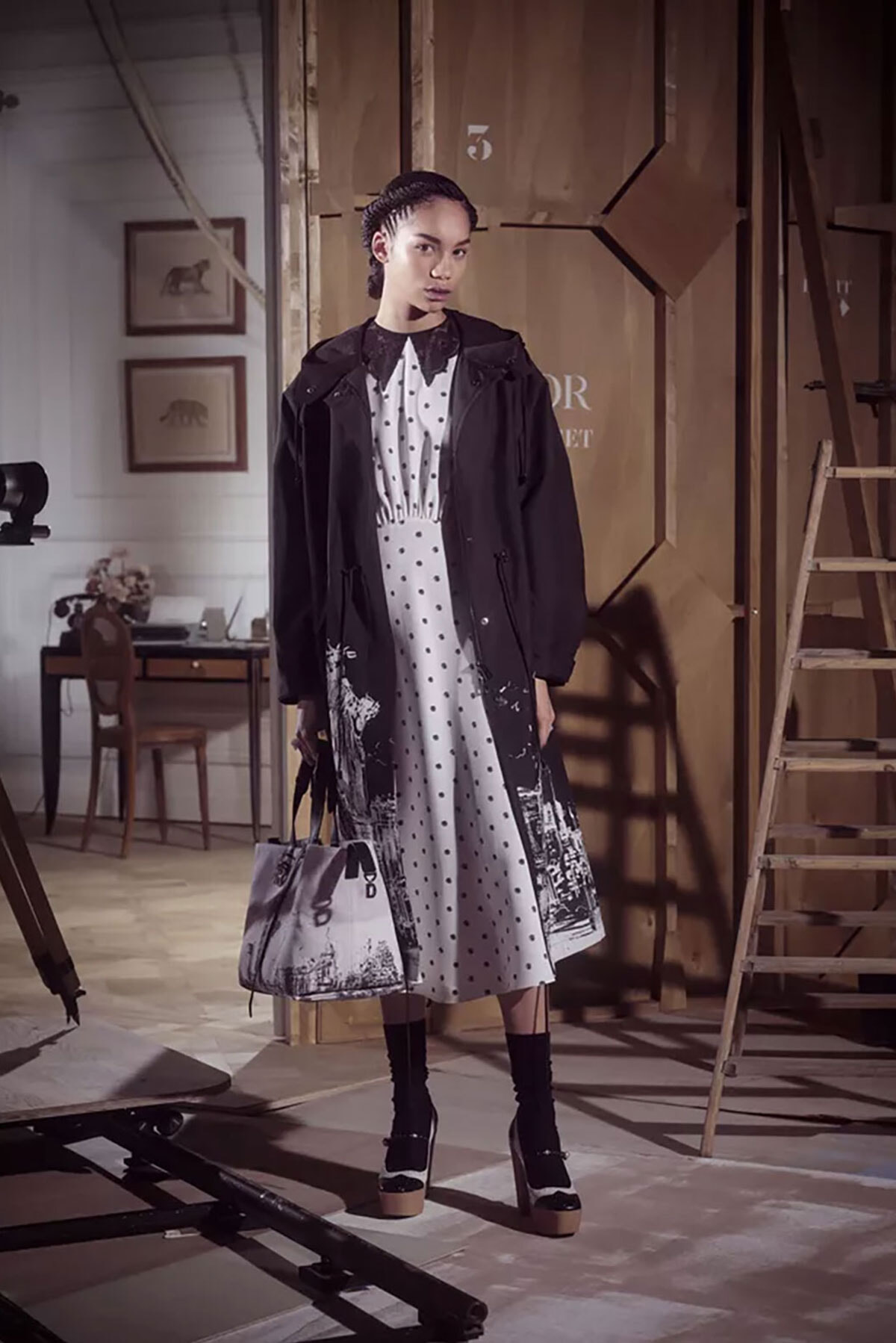 ドレスを昇華させるレトロなドット柄。ディオール2024年プレフォールコレクションにて。photography: Imaxtree