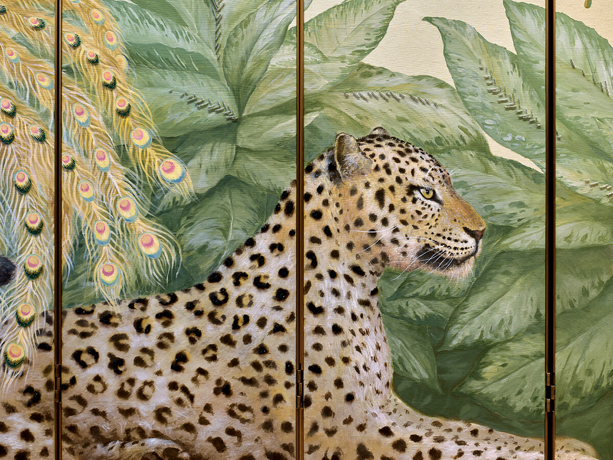 動物と植物。レジデンスの屏風はアトリエ ゴアールが描写し、リューシー・トゥーレが刺繍を施した。