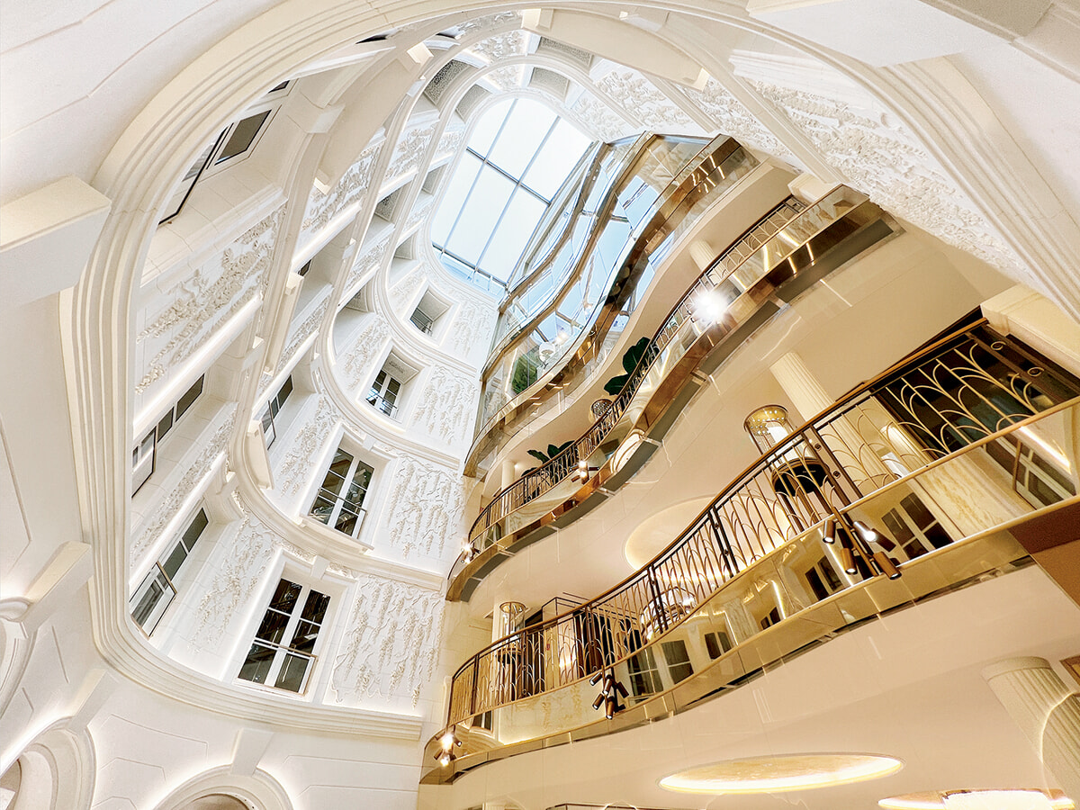 輝き、垂直性、現代性をキーワードに行われたリニューアル。地上階奥に設けられたアトリウムは6フロアに渡る縦長の吹き抜けで、ジュエリーのインスピレーション源となる植物が浮き彫りされた白い壁が天井から入る自然光を拡散させている。