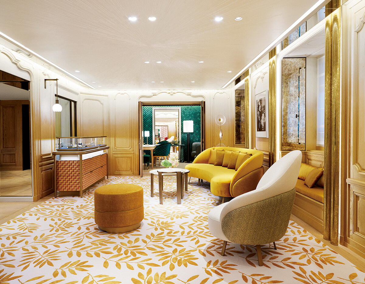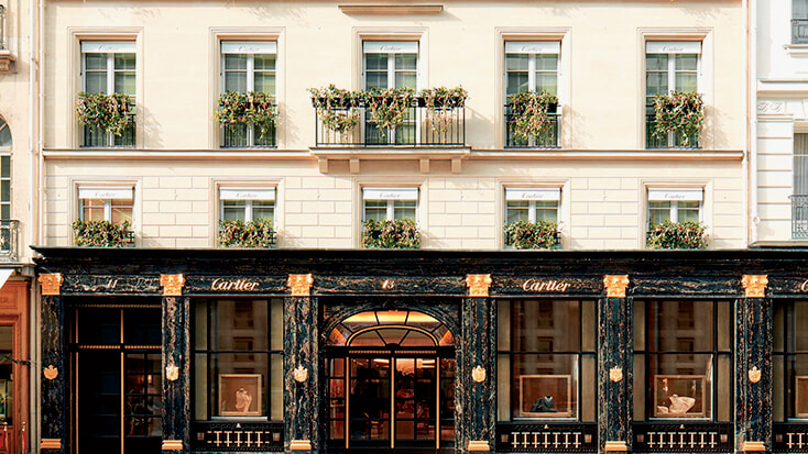 それはメゾンにとって財産である熟練の職人たちがいるからこそ可能なこと。アトリウムからの自然光が差し込む5階のアトリエで彼らは卓越の技を駆使している。それと呼応するように、昨秋のリノベーションにより、店内にはモザイク、ストローマルケトリー、レリーフ、刺繍、セラミックなどフランス装飾芸術が守るメティエダール(伝統工芸)の粋が改修時に贅沢に散りばめられた。3階のハイジュエリーのサロンはインド、アールデコ、ファウナ&フローラといった名称にふさわしい装飾スタイルが選ばれ、カルティエのジュエリーのインスピレーションの変遷を体感できる。この地で生まれたメゾンの象徴であるパンテールは、さまざまな手法で抽象あるいは具象で店内のあちこちに顔を覗かせる。まるでジャンヌが店内を鋭い視線で見守っているかのように。