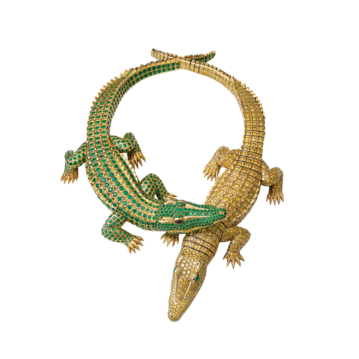 女優マリア・フェリックスの注文で1975年に制作されたクロコダイルのネックレス。カルティエによる動物の表現力に惹かれた彼女がオーダーに際し、飼っているクロコダイルのベビーをアトリエに連れてきたという有名なエピソードが残されている。
