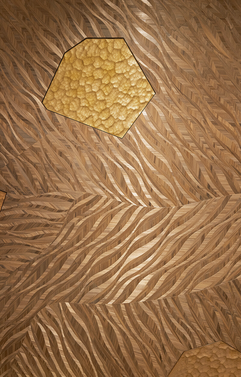 1階に置かれた装飾ガラスを嵌め込んだストローマルケトリーに、抽象的に表現されたパンテールの斑点模様。