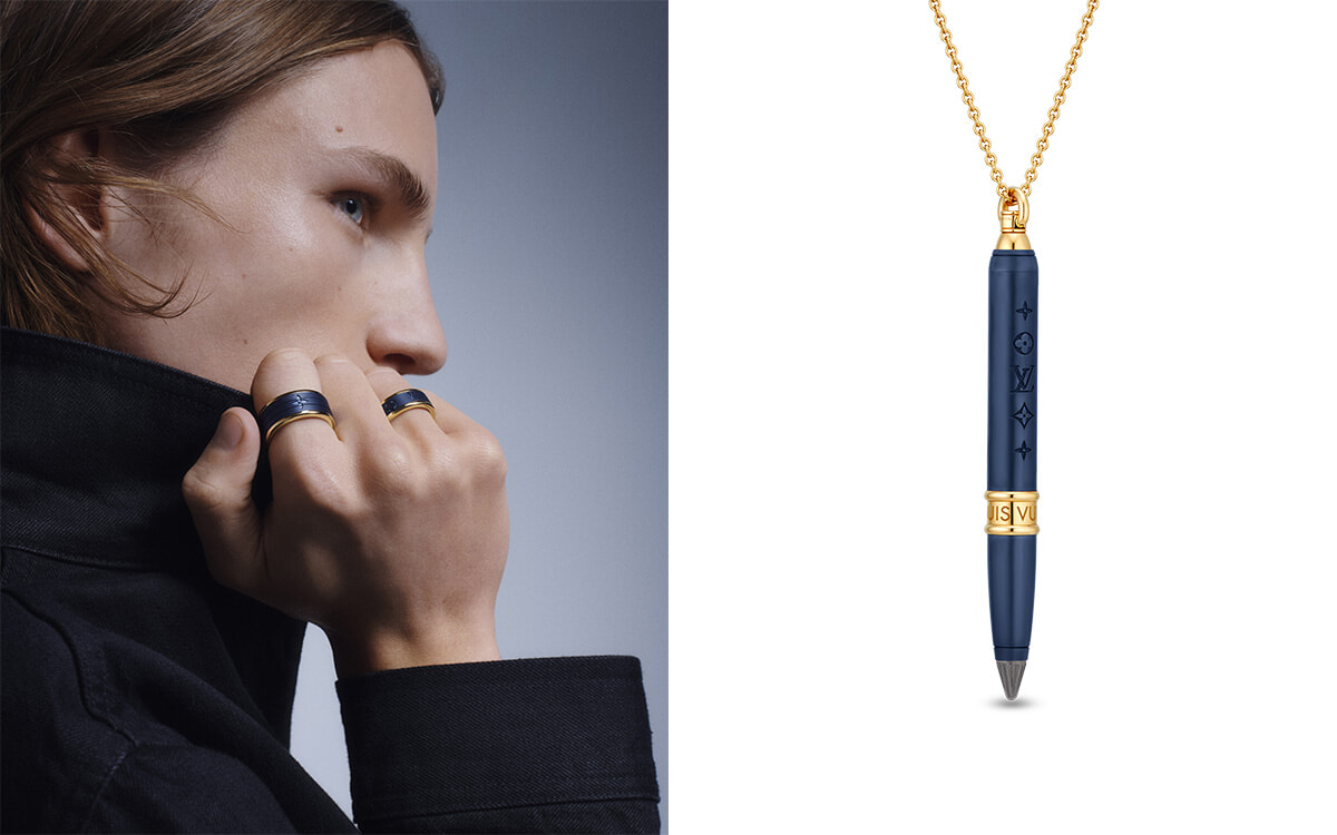イエローゴールドと組み合わされた新たな素材はソリッドながら軽いチタニウムで、デニムにインスパイアされた深いブルーは「レ ガストン ヴィトン ブルー」。左はレーザーカッティングでモノグラムを緻密に表現したリング。3つのパートが組み合わされたリングはスライドの遊びが楽しめる。右は実際に使用可能なペン・ペンダント。