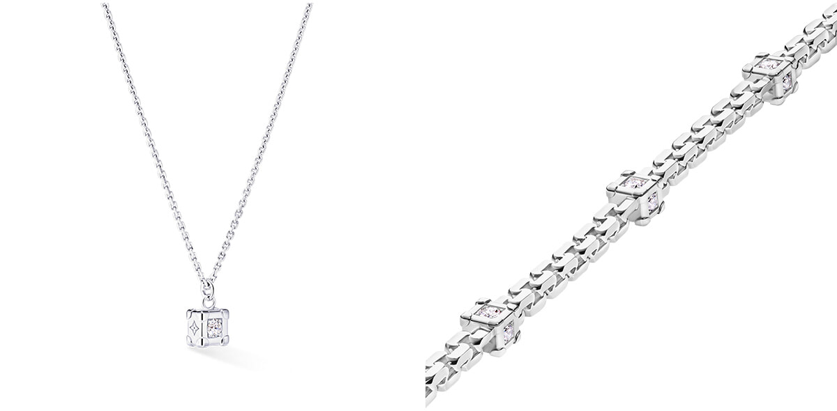 「自分はトランクの中で生まれるところだった」と生前ガストンが語っていたのは有名な話。ルイ・ヴィトンにトランクは多数あれど、これが間違いなく最小サイズ! 愛らしい極小のプロポーションに刻印が精緻に施されダイヤモンドで彩られたペンダント(左)とネックレス(右)。ピアス、ブレスレットもあり、これらも気になる。
