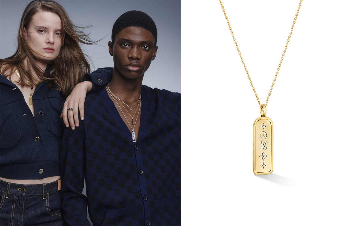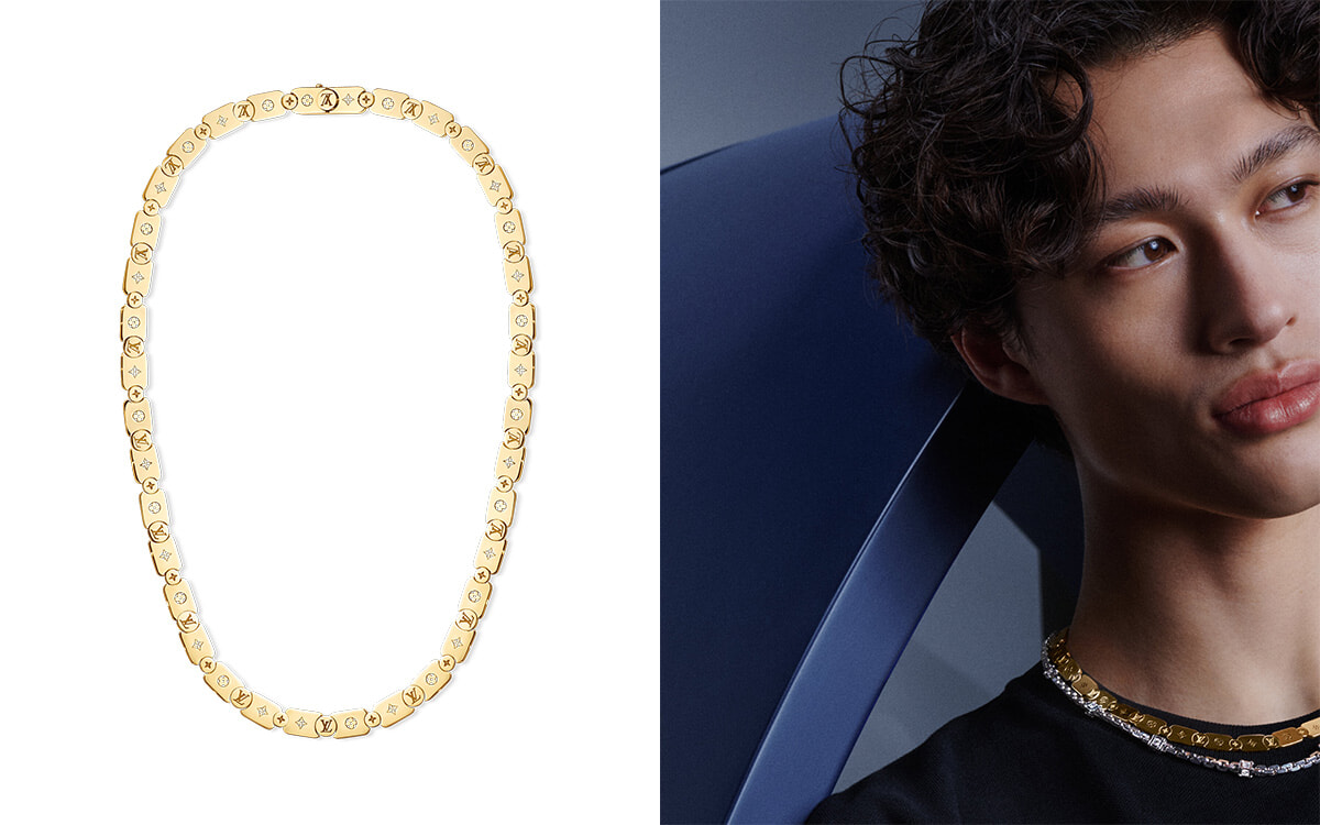 透かし彫りのモノグラムのタグペンダントはイエローゴールドあるいはイエローゴールド×チタニウムあるいはホワイトゴールド×ダイヤモンドの3タイプ。透かしモノグラムのタグピアスもあり、これはホワイトゴールドで片耳用だ。これらはコンテンポラリーでどんな装いにもマッチする。