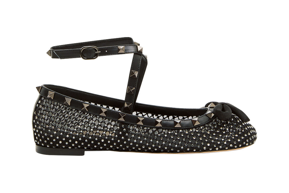 ロックスタッズをストラップに配した「ロックスタッズ クリスタルアップリケ メッシュ バレリーナ」(ヒール0.5cm)¥185,900/ヴァレンティノ ガラヴァーニ(ヴァレンティノ インフォメーションデスク)