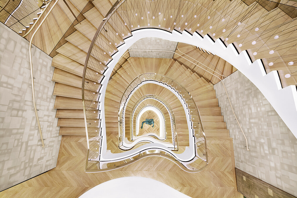 エルサ・ペレッティの官能的で有機的なフォルムをイメージした螺旋階段はペレッティの名作を思い起こさせる。