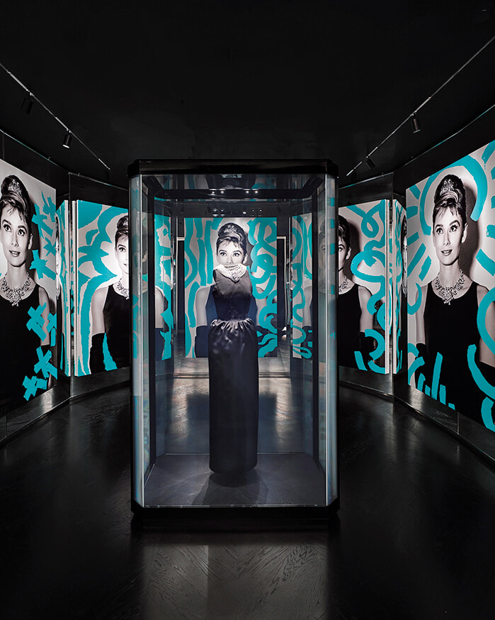 『ティファニーで朝食を』のシーンが次々に浮かび上がる没入型インスタレーション。貴重なドレスやコスチュームジュエリー、台本の展示も。