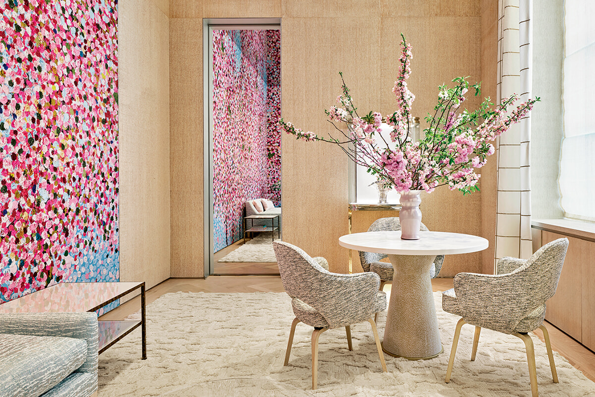 ダミアン・ハーストの『アップルブロッサム』を壁紙にしたプライベートルームは、豪華ながらも寛げる雰囲気。