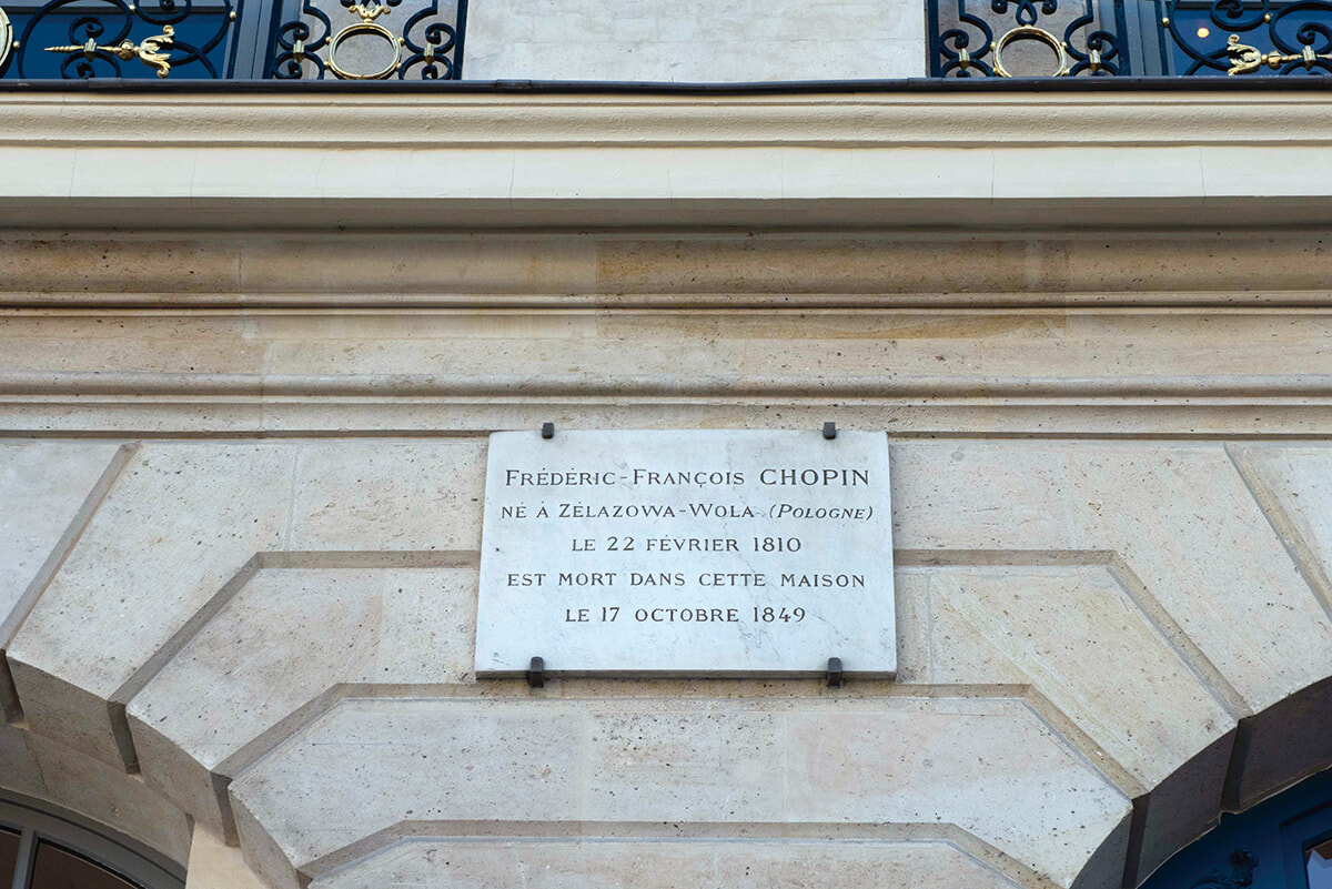 エントランスに「フレデリック=フランソワ・ショパン、1849年10月17日、この邸宅で死去」のプレートがある。