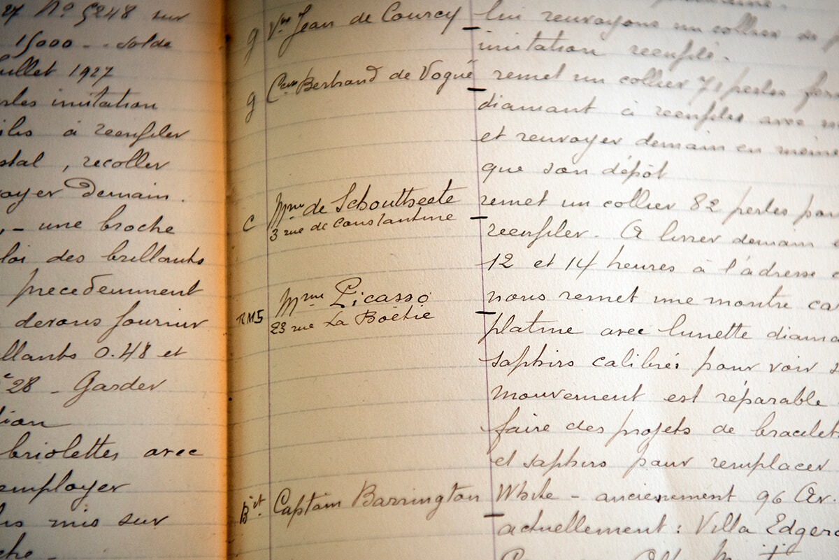 顧客の依頼が美しい筆跡で記録された訪問台帳。1927年、マダム・ピカソがダイヤモンドとエメラルドの時計をブレスレットに作り替える相談に訪れた記述が残る。