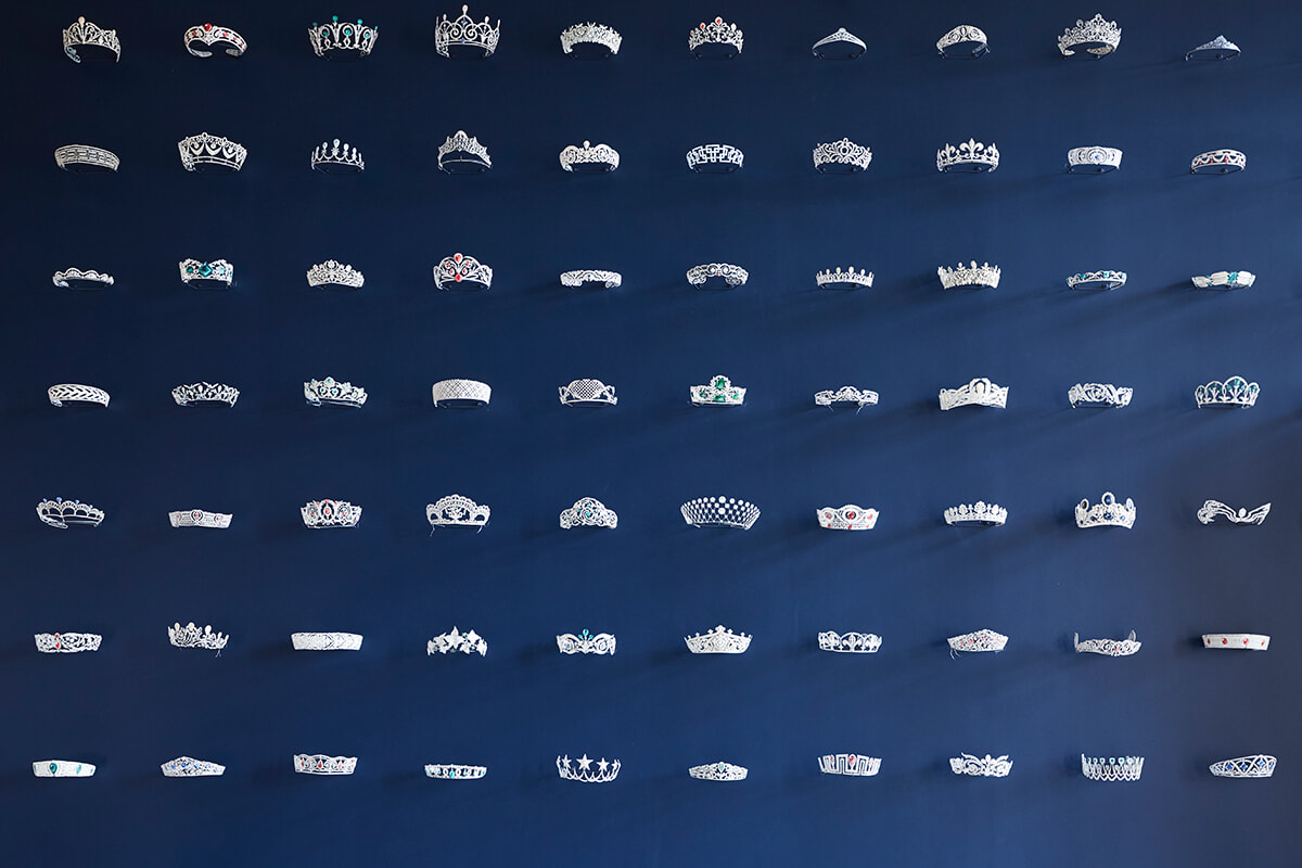 3階のグラン・サロンには、ショーメを象徴するブルーの壁に数百ものマイヨショール(ティアラの模型)が飾られたティアラのサロンがある。