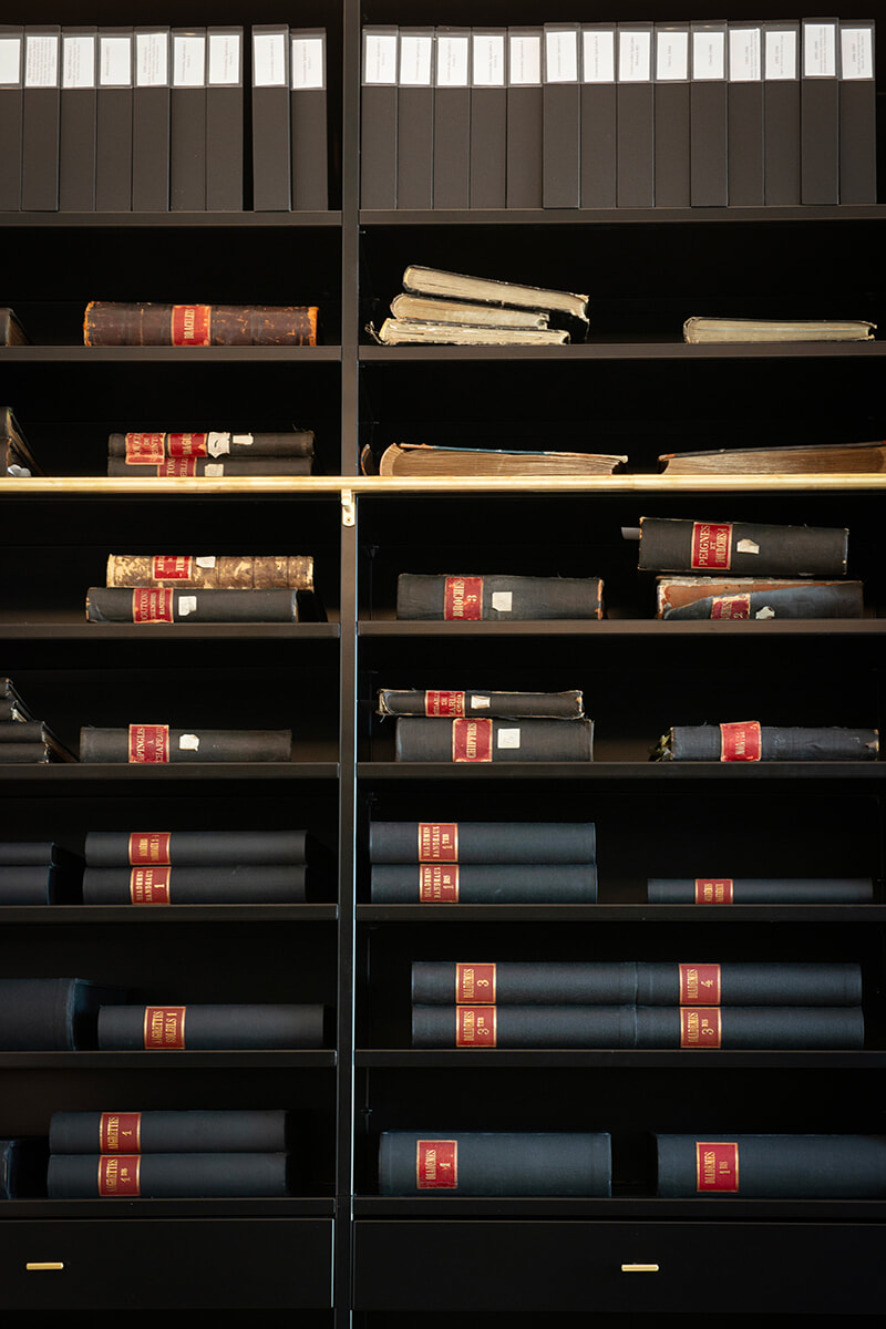 天井まで届く書棚に、ずらりと並ぶグアッシュの台帳。ティアラ、指輪、ペンダントなど、アイテムごとに整理されている。