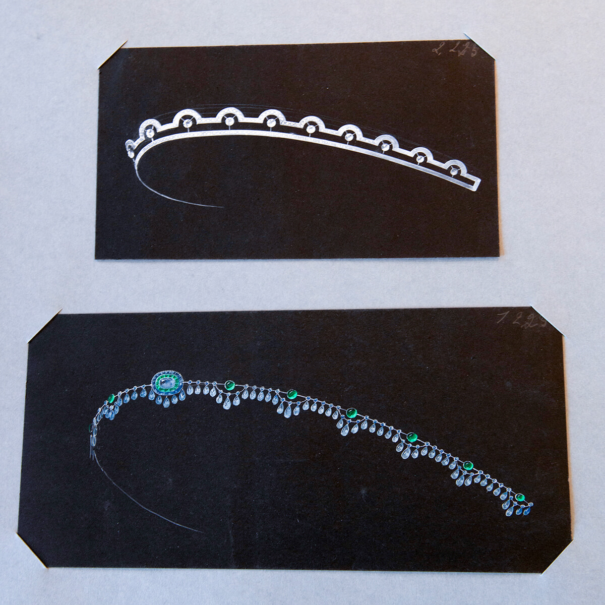 クリエイションの前段階となるデザインを描いたグアッシュ。100年以上前のティアラのデッサンも美しく保存される。