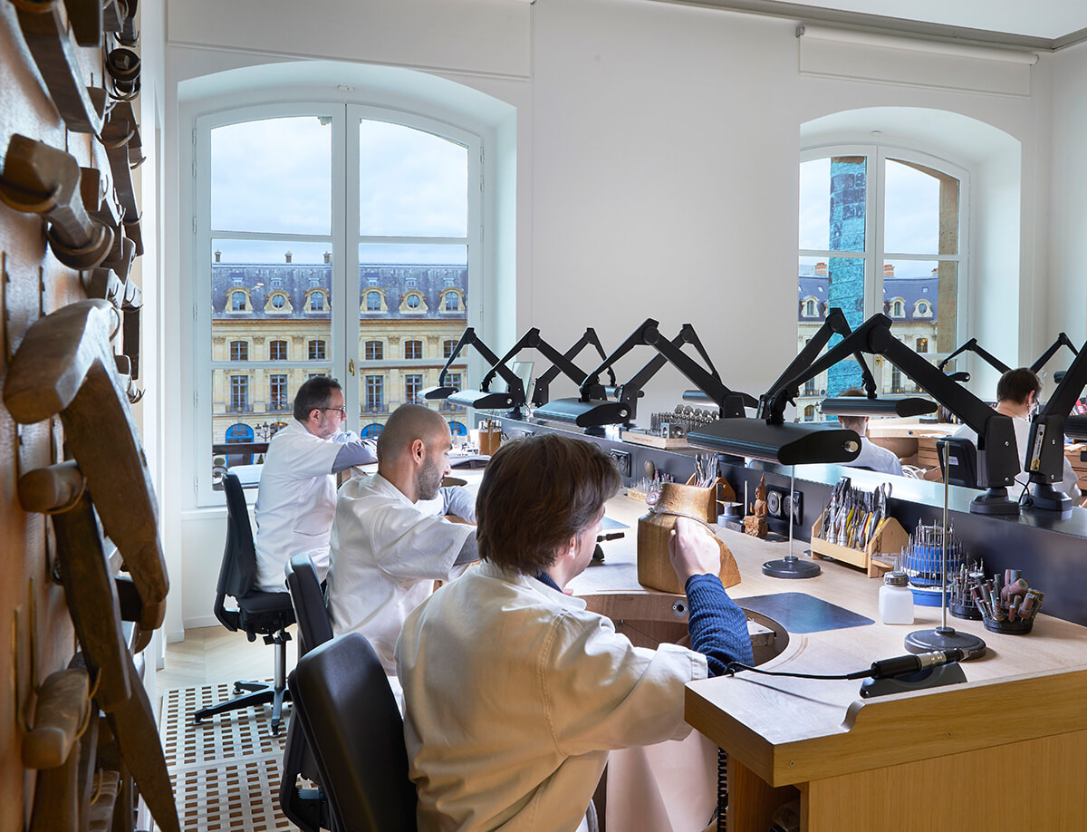 ヴァンドーム広場を望む4階にはハイジュエリーの職人が働くアトリエがある。
