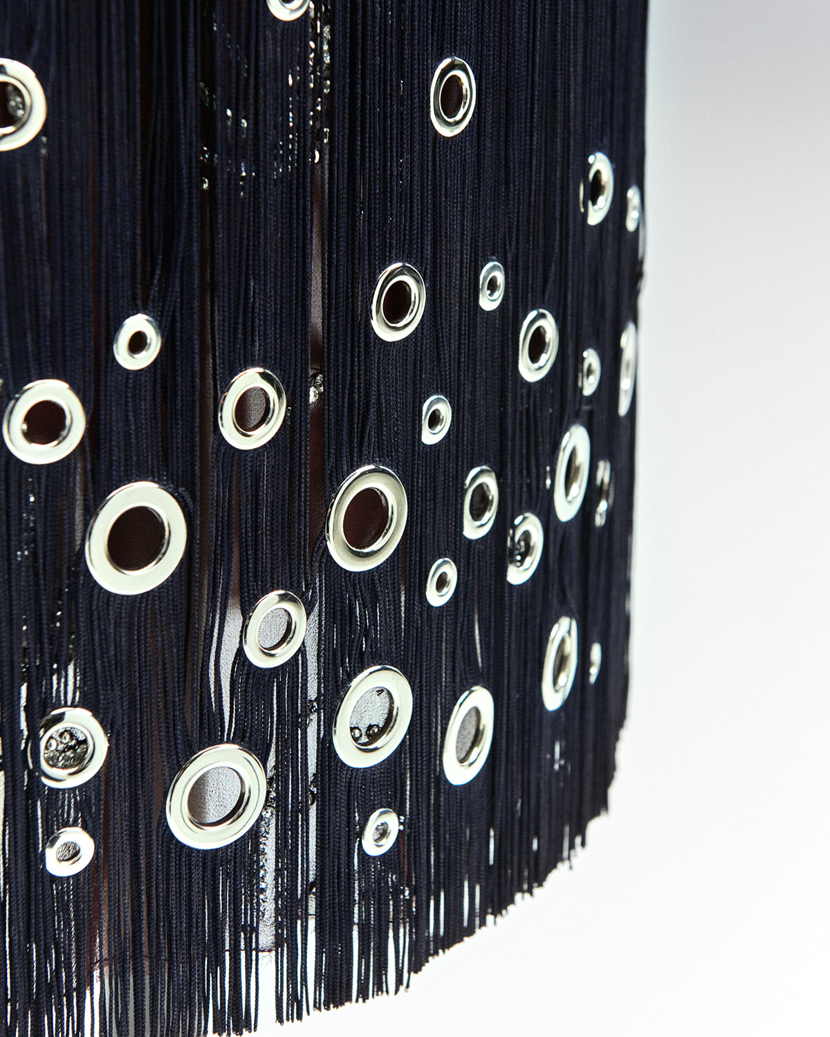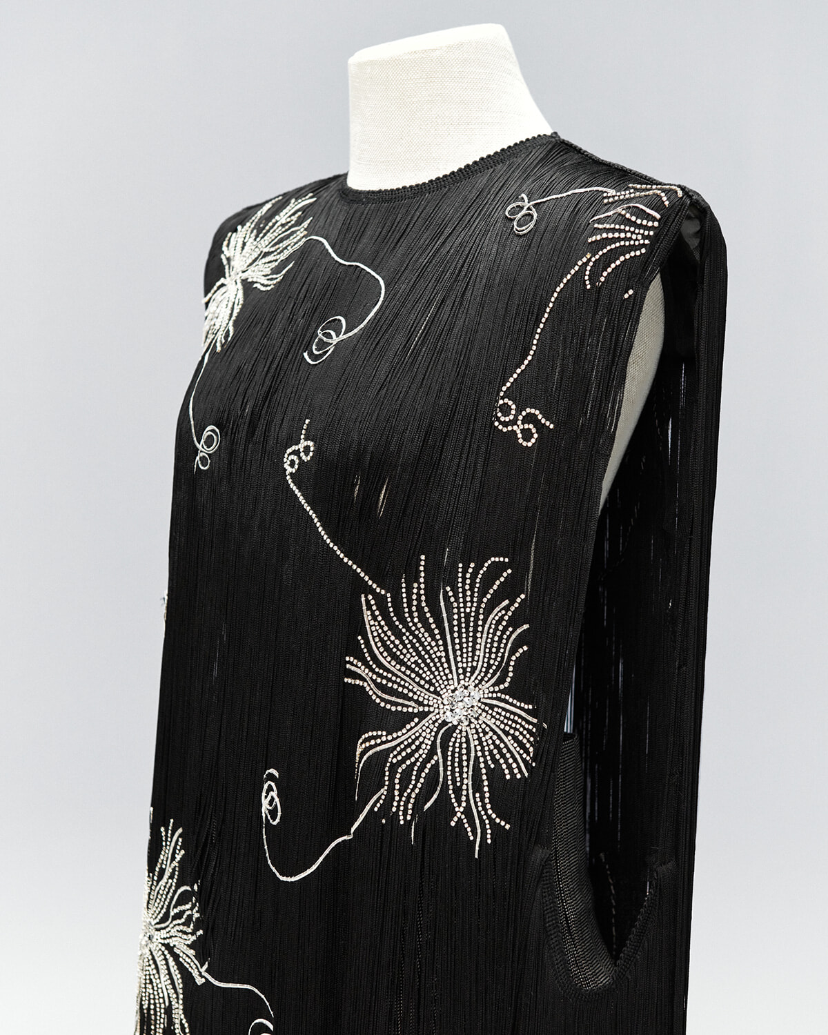 特殊な糸を使用したフリンジスカートには、3種類の大きさのアイレットが全体に75個施されているが、その技巧の複雑さは何千本もの糸が緩んで絶えず動いている構造に表れていて、全工程に3~5日もかかることから、高度なテクニックが必要とされるのがわかる。