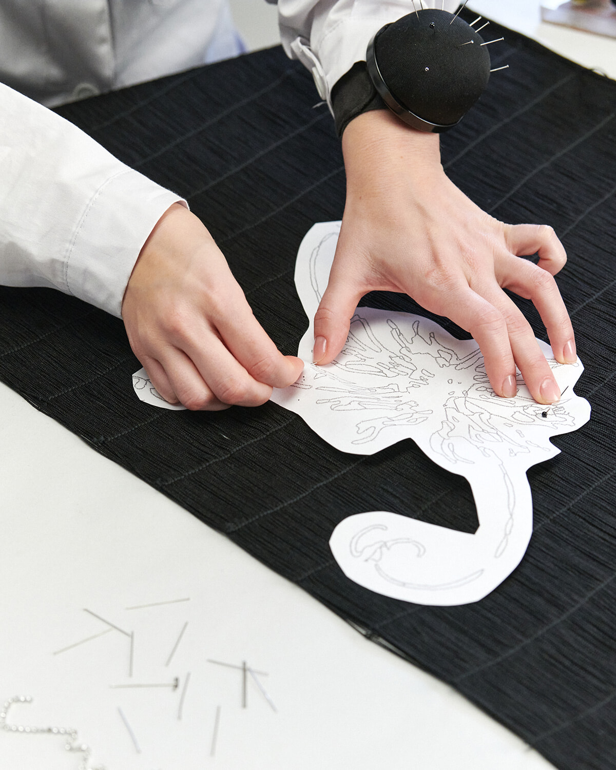 丁寧に整えたフリンジの上に、刺繍するモチーフの型紙を置く。