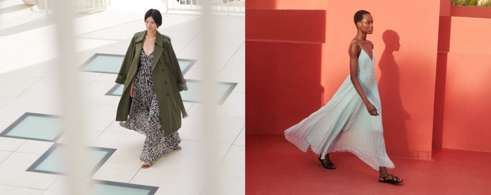 最新コレクションの中で、まず惹かれたのは鮮やかなカラーパレット。淡いピンクや水色の愛らしい色合いも、洗練されたデザインと機能でアップデートされて大人のためのウエアになっているのがユニクロ:シーの素晴らしいところ。プリーツドレスは水色のボディに赤のドットがあしらわれていて、フレンチシネマの主人公のような一枚に胸がキュンとしました。「これを着て、バカンスに行きたい」と、最初のコーディネートはまだ予定のない(!)休暇に思いを馳せて。主役のドレスに淡いトーンのピンクのシャツで、日差しに似合う優しいコントラストを描きます。シャツはさらっと肩にかけたり、ウエスト部分できゅっと裾を結んでもかわいい。つばが広くモードな表情のハットには、UVカット機能が施されていました。荷物が多くなる旅に、心強い相棒となる大容量のショルダーバッグも追加。